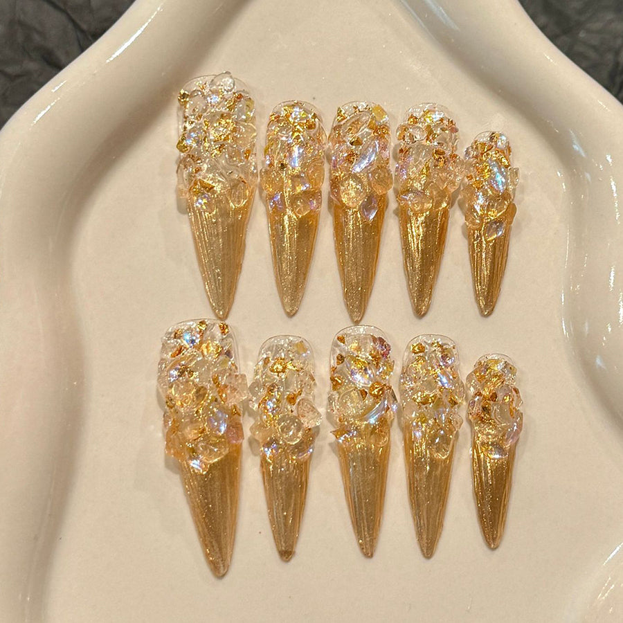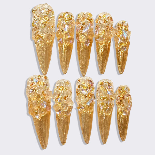 Elegant stiletto nails in warm amber hues, embedded with sparkling crystal shards and iridescent glitter. Each nail shimmers like sunlight through honeyed glass—bold, luminous, and full of magical allure. A statement piece that captures the essence of nature’s glow.