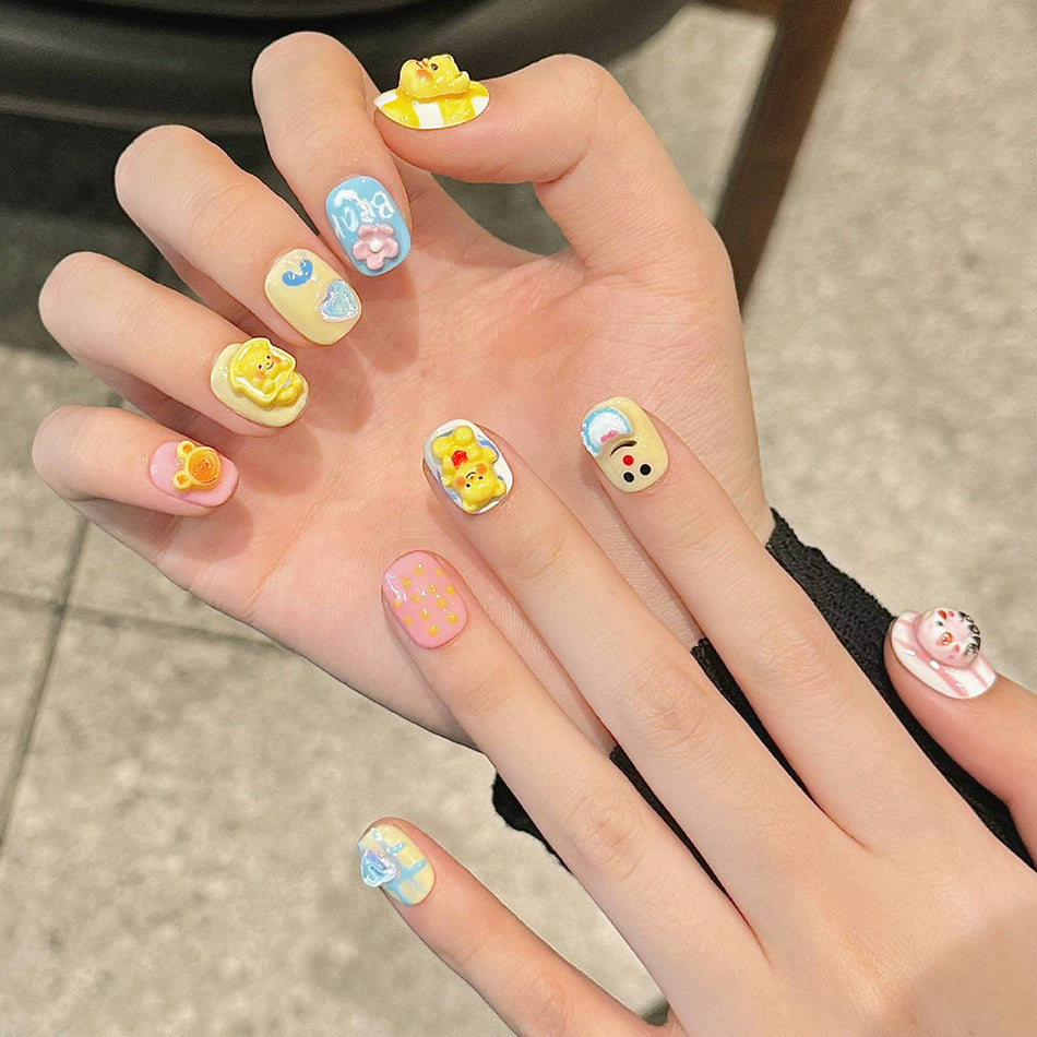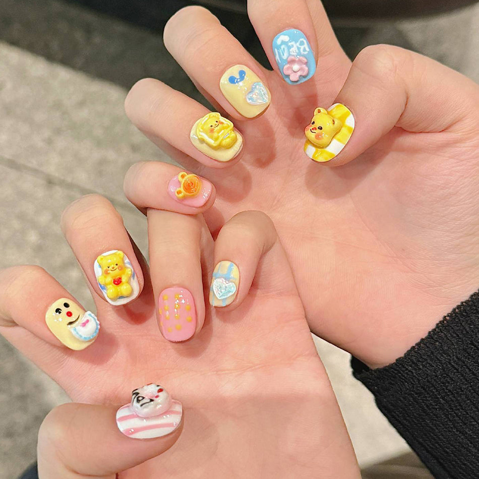Whimsical and joyful, these 3D press-on nails feature adorable bear faces, soft pastel colors, and playful patterns. Each nail is a tiny story of charm and sweetness—perfect for those who love kawaii style with a touch of warmth and fun.