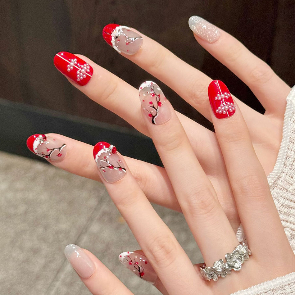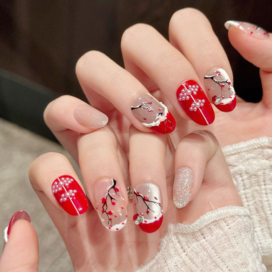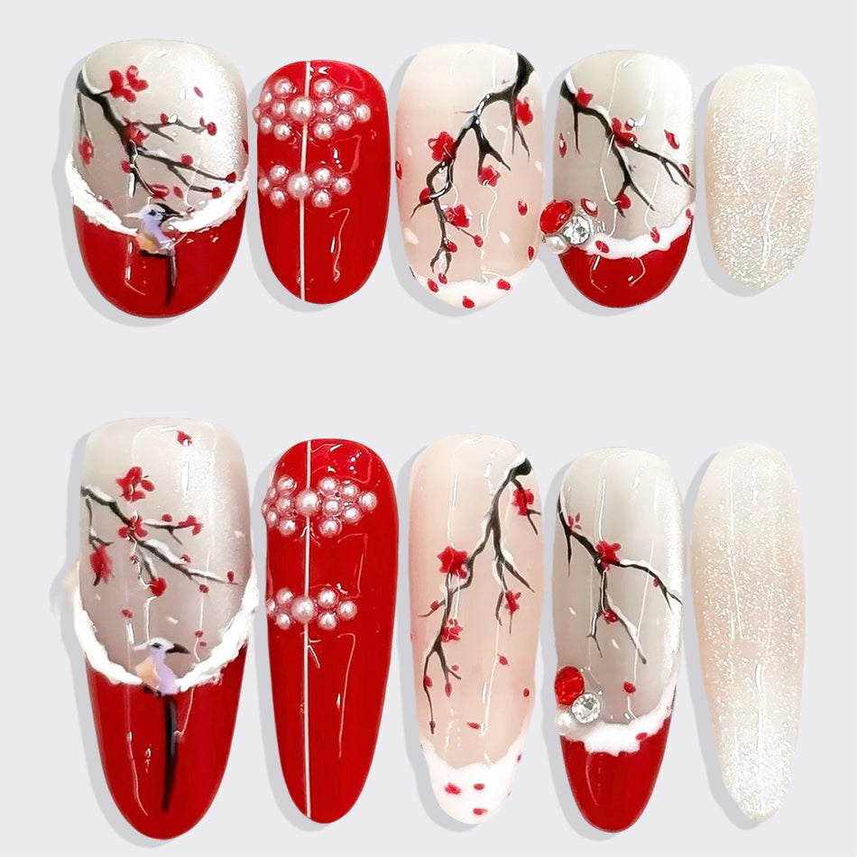 Elegant nails inspired by winter plum blossoms, featuring delicate red flowers, snowy accents, and pearl details on a soft cream and bold red base. A poetic design that blends traditional beauty with modern elegance—perfect for capturing the quiet grace of spring’s first bloom.