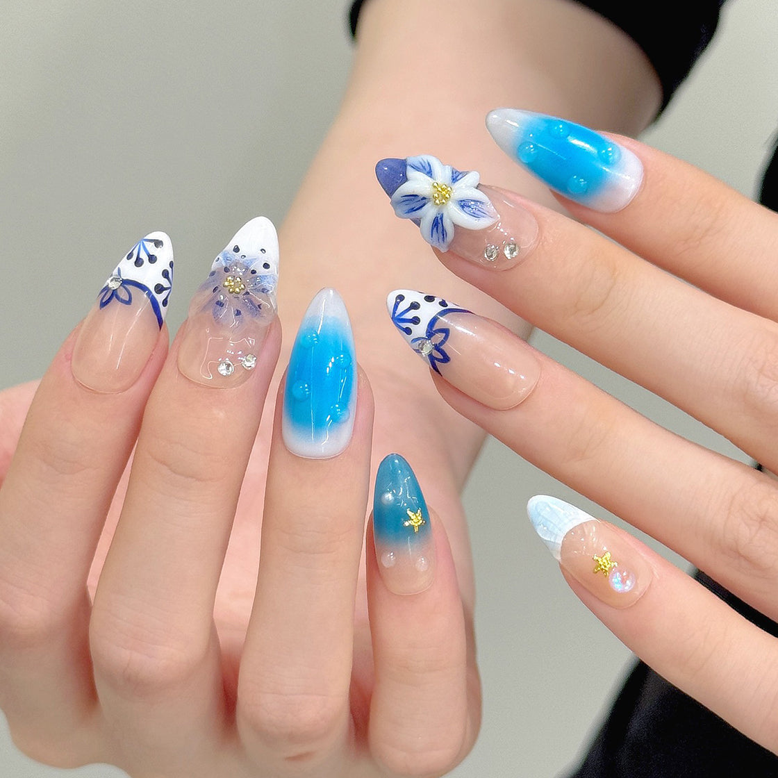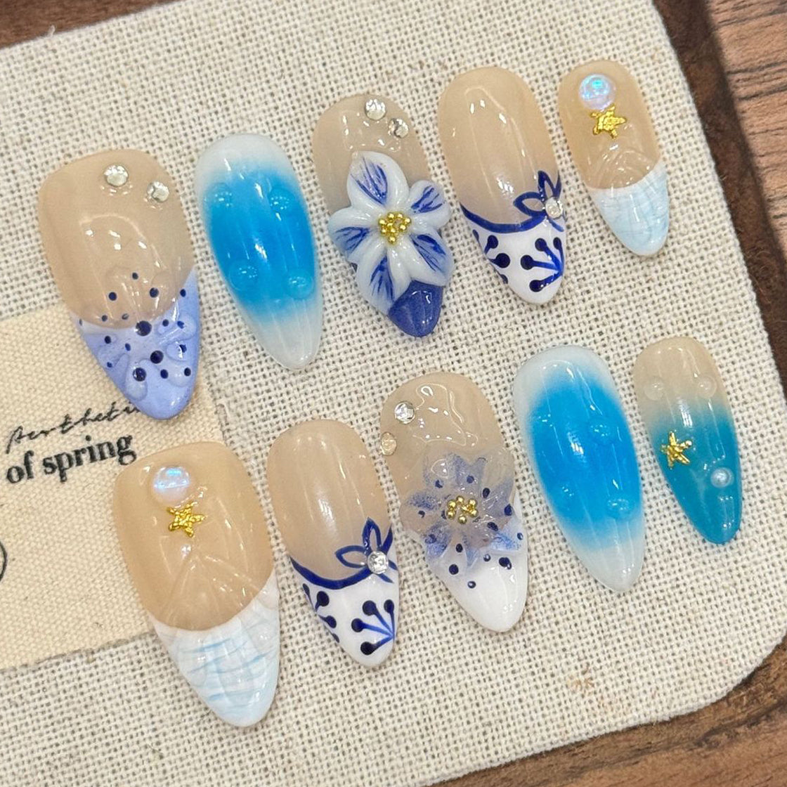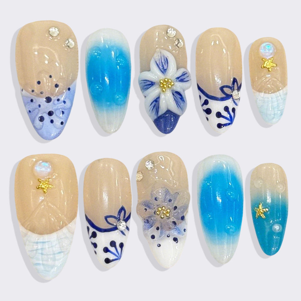 Inspired by the ocean’s calm beauty, these press-on nails feature soft blue gradients, delicate floral designs, and elegant gold starfish accents. With hand-painted patterns and shimmering details, they bring a touch of seaside elegance to every glance. Perfect for dreamy, coastal-inspired style.