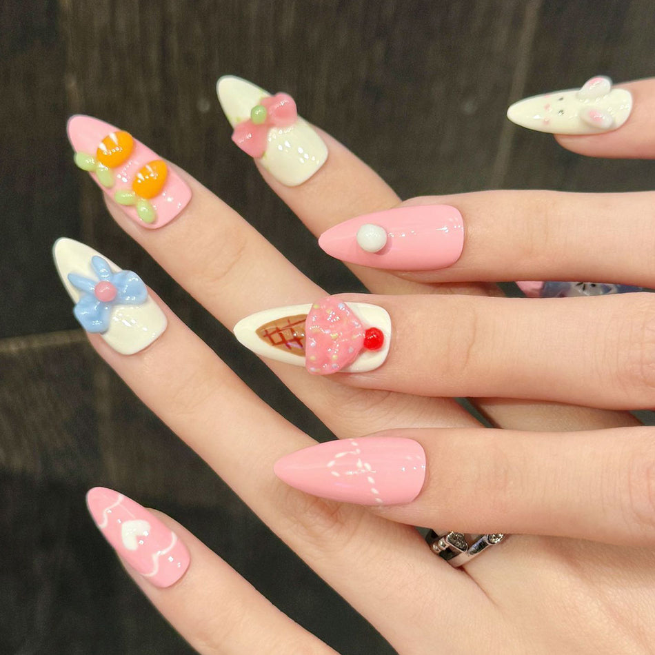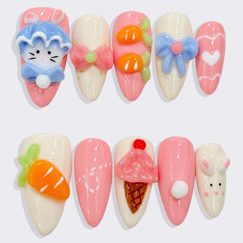 Delicate and whimsical, these handcrafted press-on nails feature playful Easter motifs—bunnies, carrots, bows, and sweet treats in soft pastels. Each nail is a tiny work of art, blending charm and elegance for a dreamy, spring-ready look. Perfect for adding a touch of joy to your fingertips.