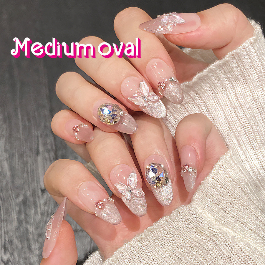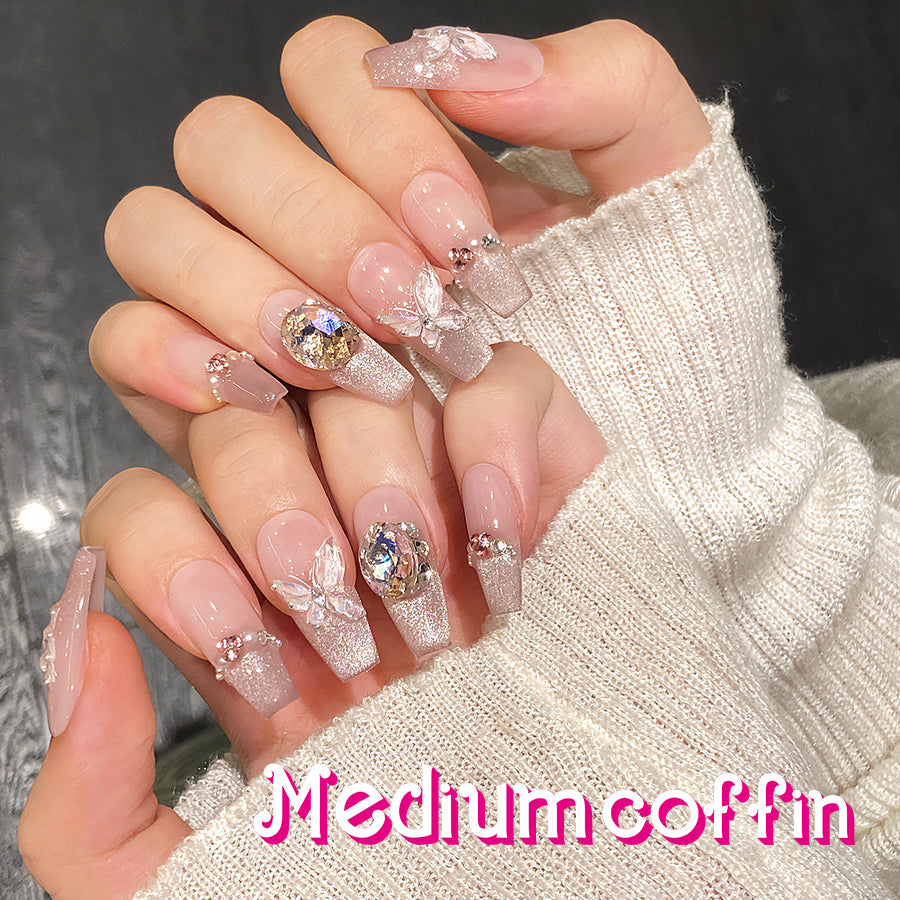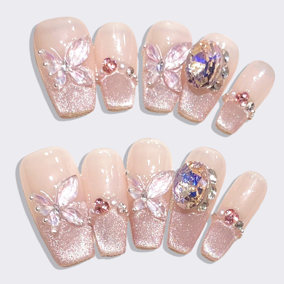 Embrace whimsical luxury with Butterfly Fantasy nails. Featuring 3D butterflies, sparkling rhinestones , and a blush-pink shimmer base, they blend fairy-tale charm and glamour. Perfect for romantic, eye-catching styles.