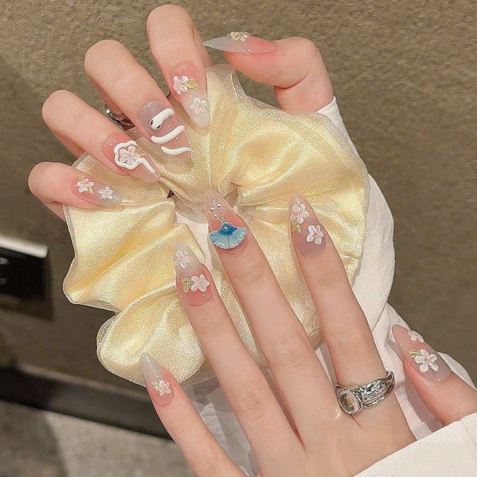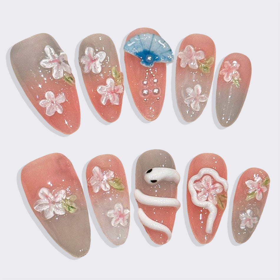 Soft peach tone form a refined backdrop for delicate cherry blossoms and a gracefully coiled snake accent, adorned with subtle pearls and blue fan. This captivating design merges nature’s elegance with a touch of enigmatic allure—bold yet beautifully balanced.