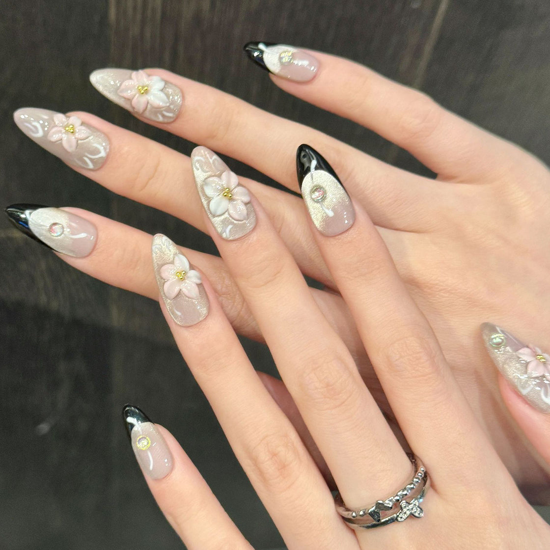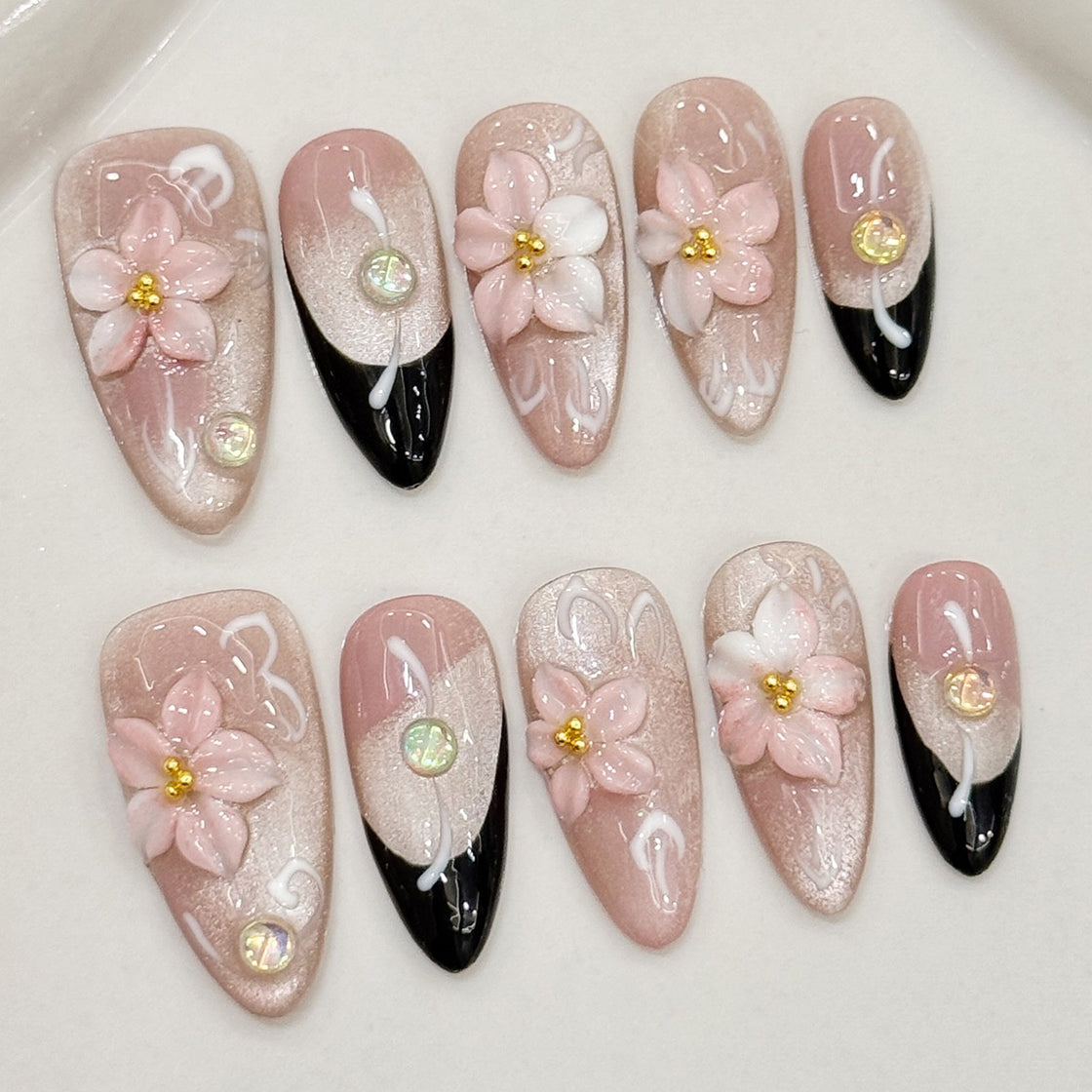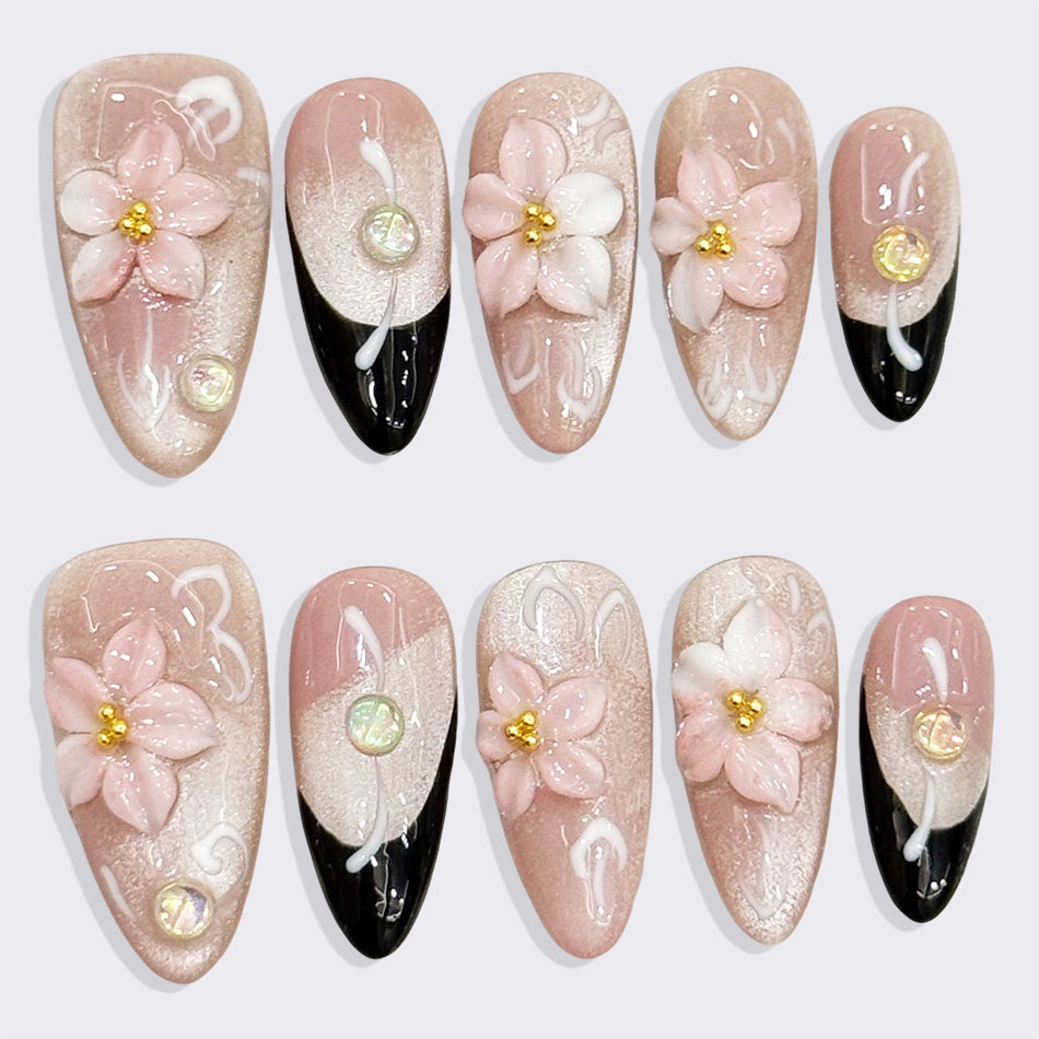 Delicate pink blossoms bloom atop soft shimmering nails, accented with golden centers and elegant black tips. This refined set blends floral romance with modern contrast—perfect for adding a touch of graceful elegance to any look.