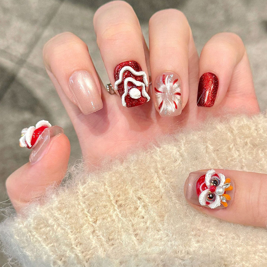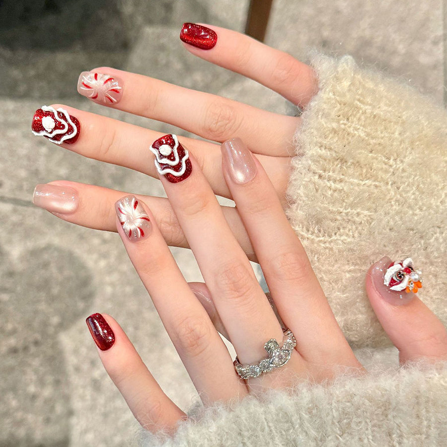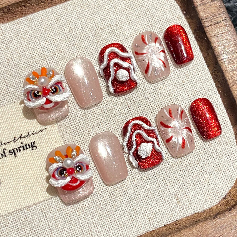 Celebrate tradition with Chinese Lion Dance Festive Glam nails. Featuring 3D lion dance motifs, red fireworks, and glitter accents, they blend cultural charm and festive sparkle.