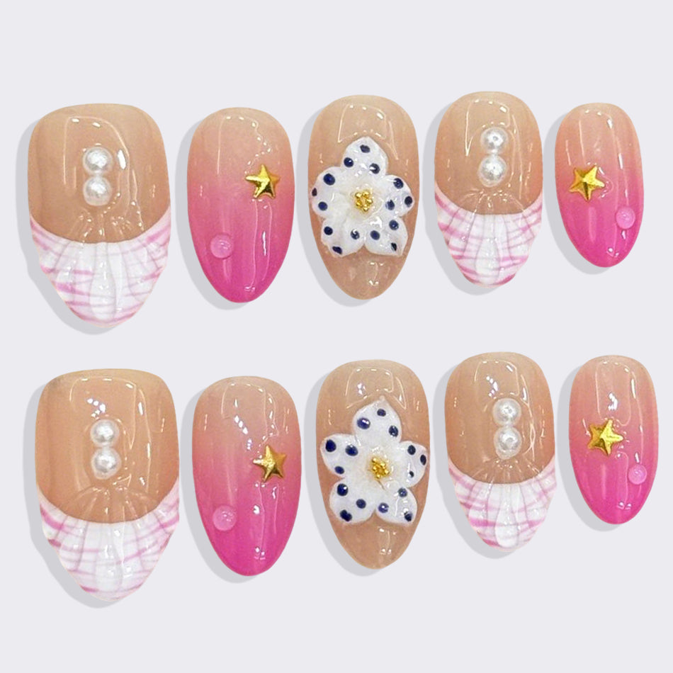 Elegant and whimsical, these press-on nails blend soft pink gradients with delicate gingham patterns, shimmering gold stars, and pearl accents. A charming floral centerpiece adds a touch of romance, perfect for those who love sweet, feminine style with a hint of sparkle.