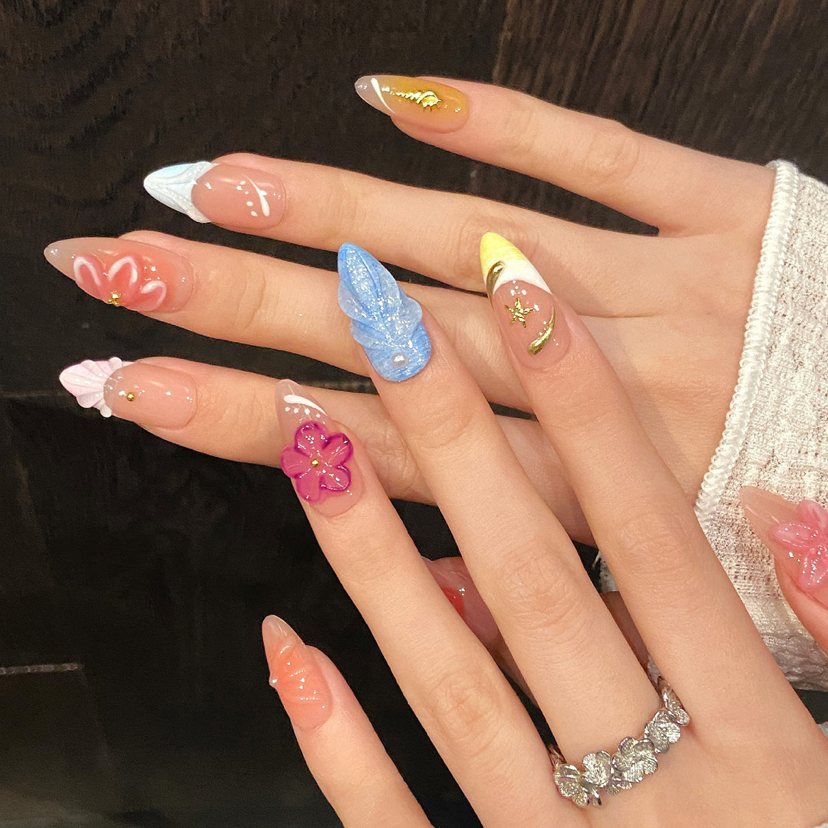 A dreamy seaside escape unfolds on these press-on nails, blending soft pinks, ocean blues, and 3D flowers with golden stars and shell accents. Each nail captures the magic of a tropical sunset—perfect for adding a playful, romantic touch to your style.