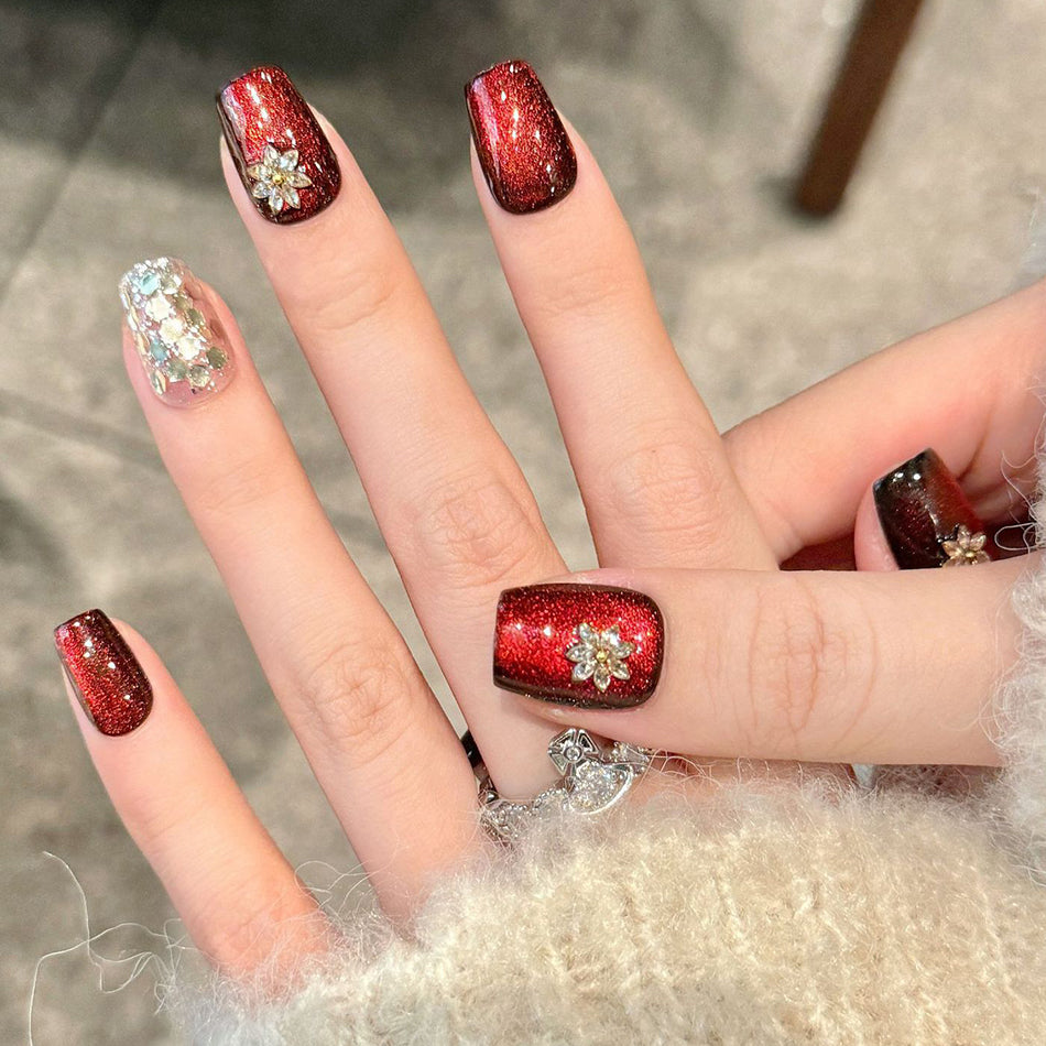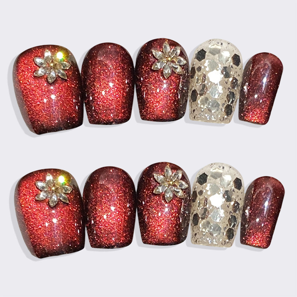 Deep red glitter meets radiant crystal flowers and shimmering mosaic accents, creating a luxurious, high-fashion look. These nails exude bold elegance—perfect for making a statement with rich color and dazzling detail.