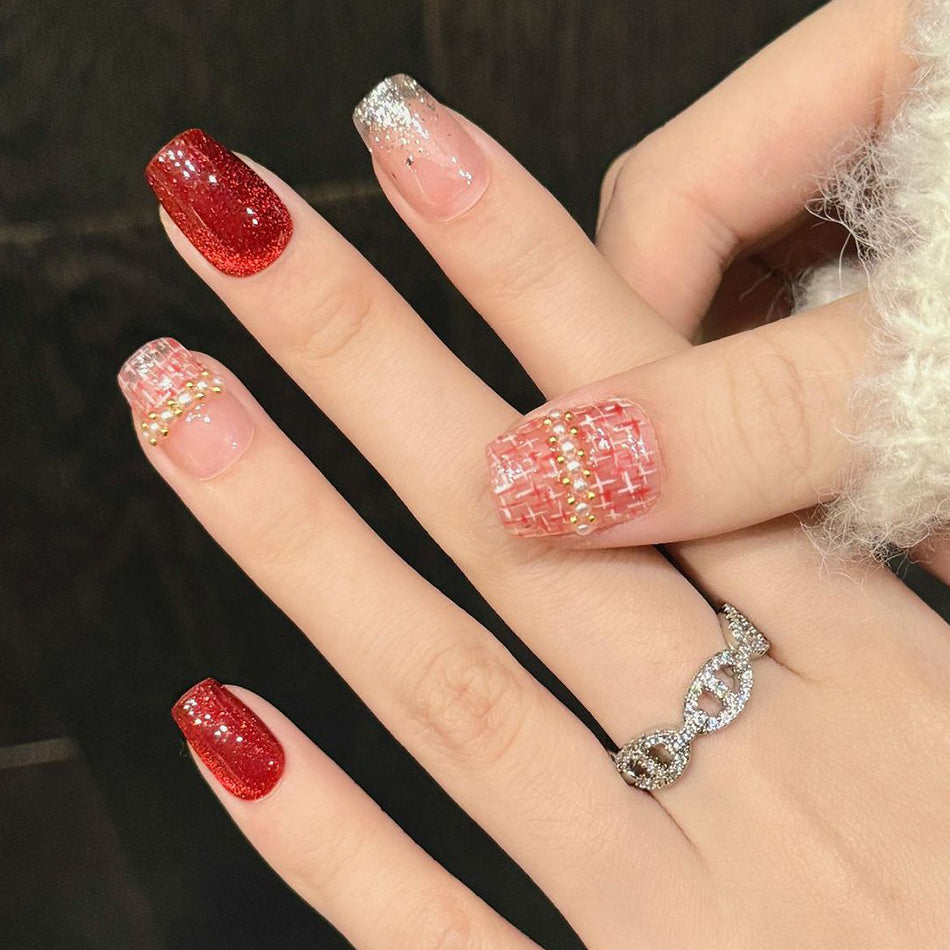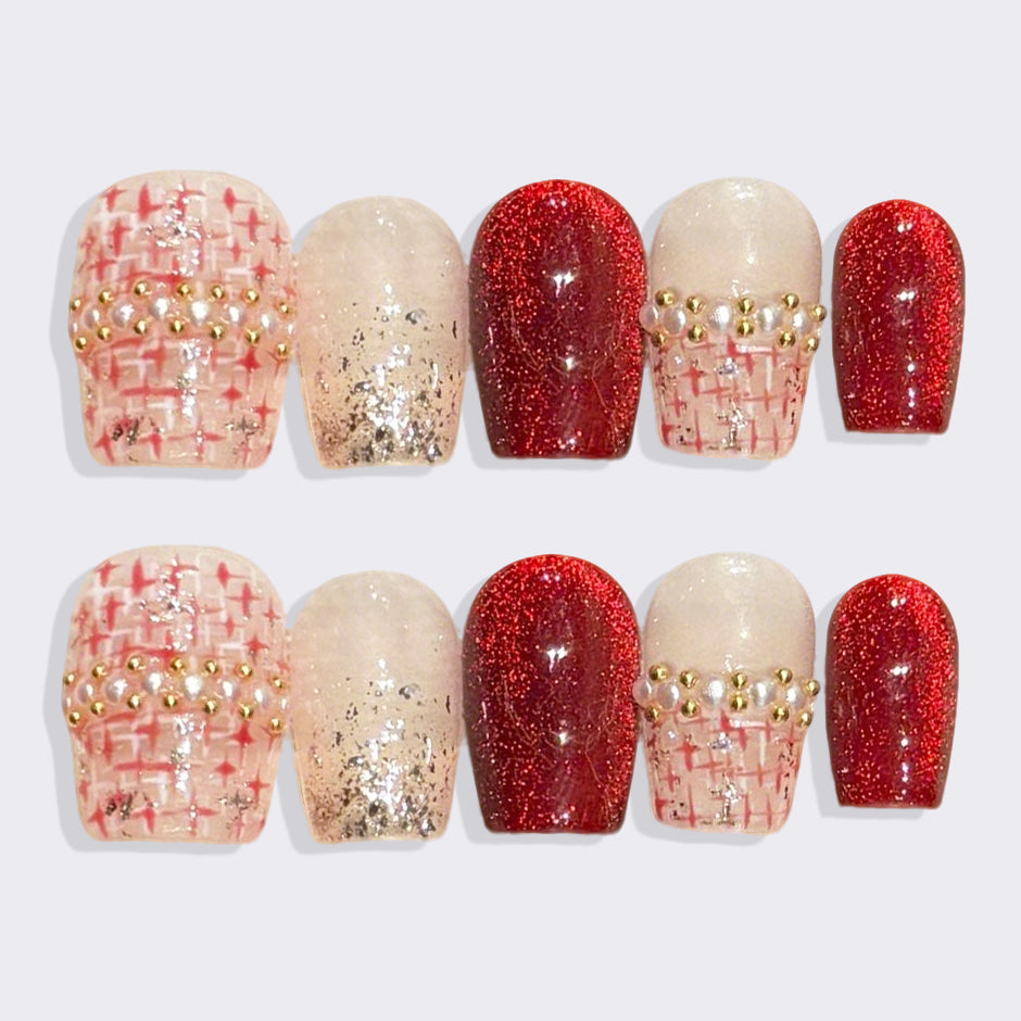 Rich reds and soft beige nails adorned with elegant plaid patterns, shimmering glitter, and delicate pearl accents create a luxurious winter look. The blend of bold texture and refined details evokes cozy elegance—perfect for embracing the season’s warmth and charm.