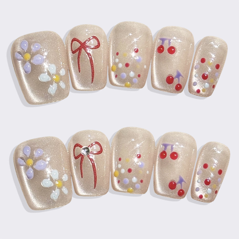 Delicate floral patterns, playful cherries, and tiny colorful dots dance across a soft shimmering base. A charming blend of sweetness and elegance—each nail tells a story of springtime joy and delicate romance. Perfect for those who love subtle sparkle with a touch of whimsy.