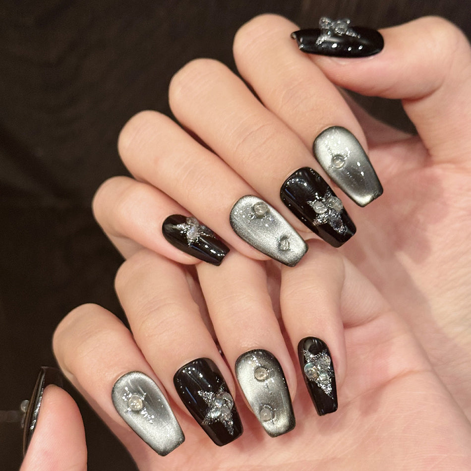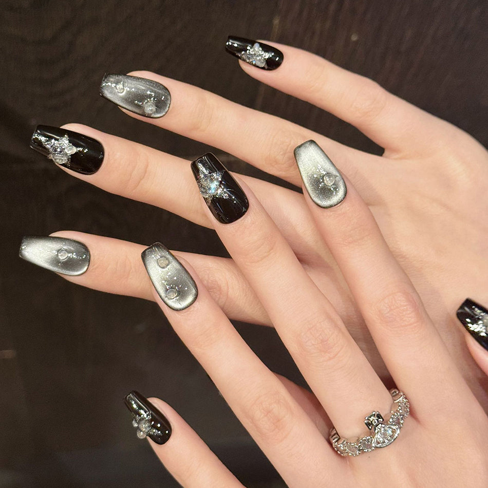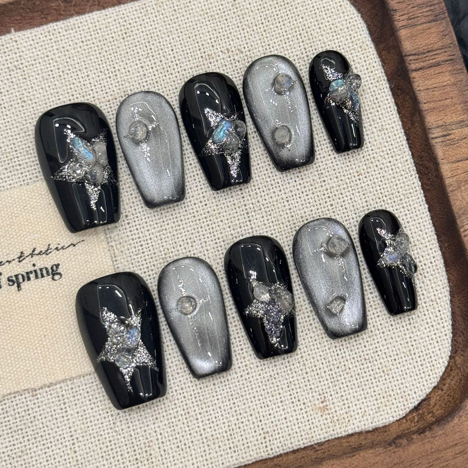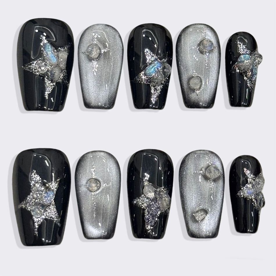 Bold black meets icy silver with dazzling star-shaped crystals and cosmic glitter. These edgy press-on nails radiate mystery and power—perfect for those who dare to stand out with a bold, futuristic edge.