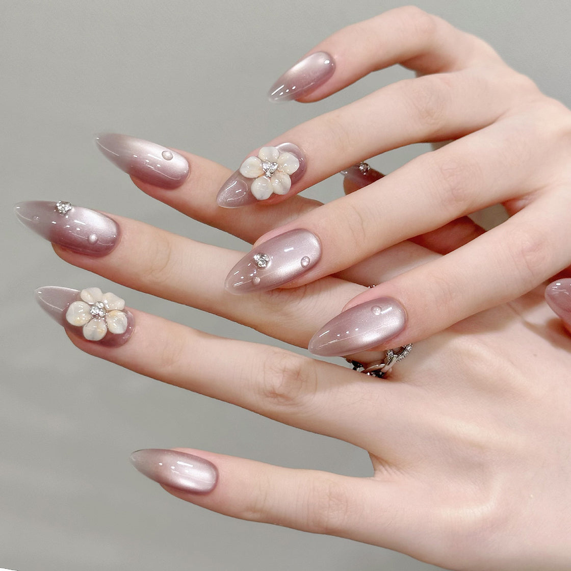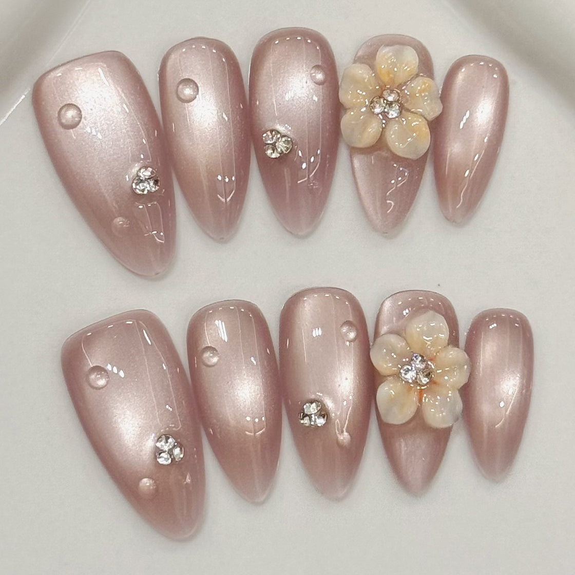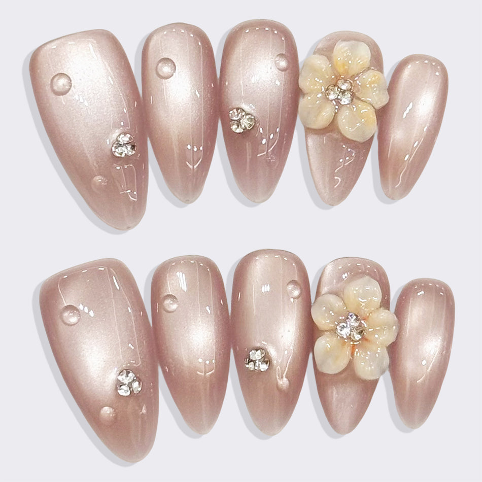 Delicate and refined, these press-on nails feature a soft blush base with subtle shimmer, elegant 3D flowers, and tiny crystal accents. Inspired by morning dew on petals, they radiate gentle beauty—perfect for adding a touch of feminine grace to any look.