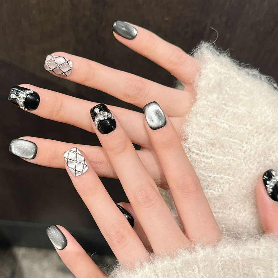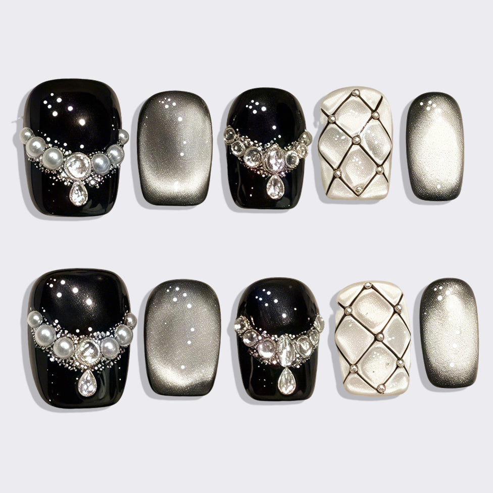 A striking blend of deep black, shimmering silver, and luxurious pearl accents creates a timeless, high-fashion look. Elegant crystal details and quilted patterns add sophistication, making these nails perfect for a glamorous night out or a bold statement of refined style.