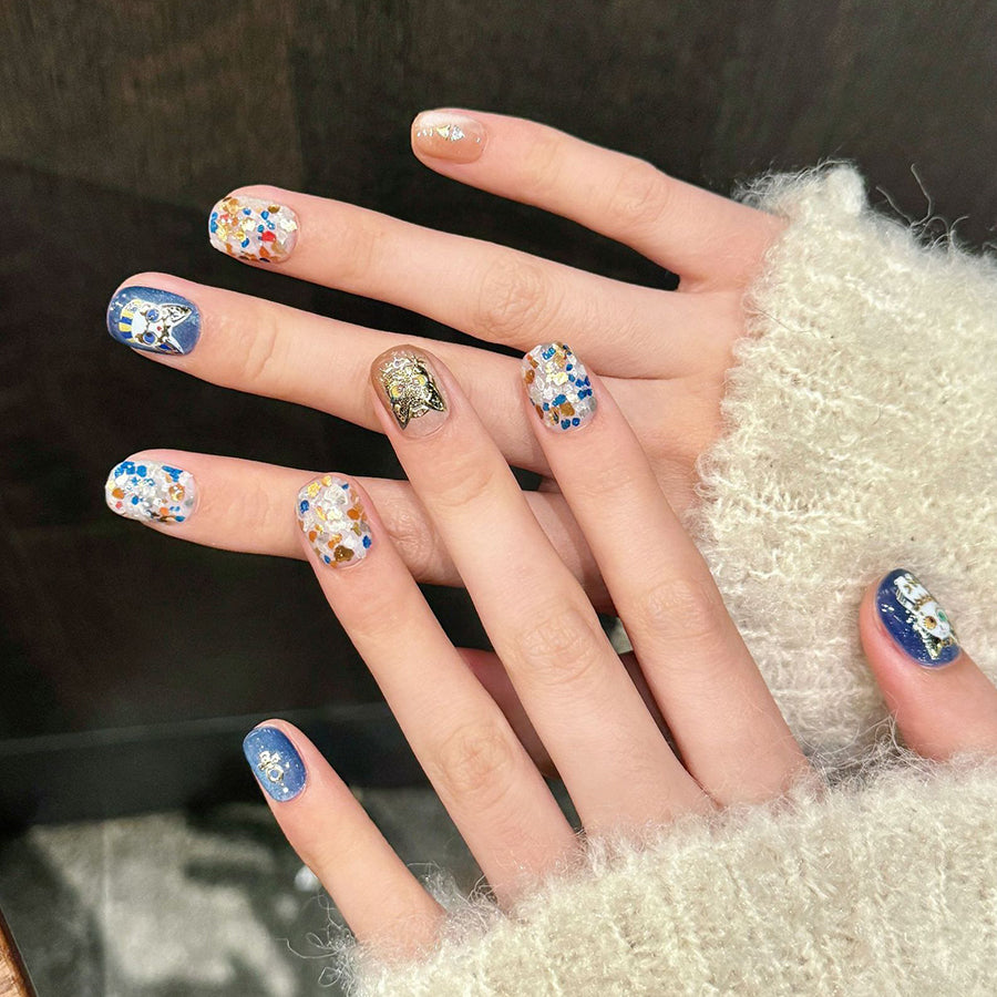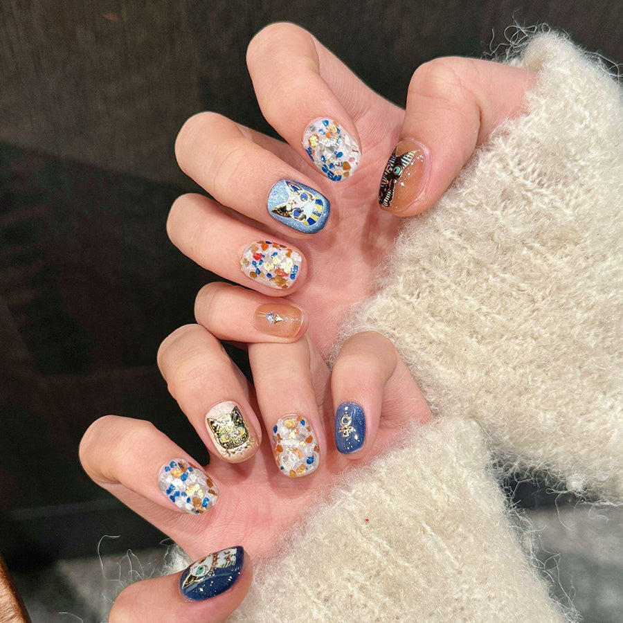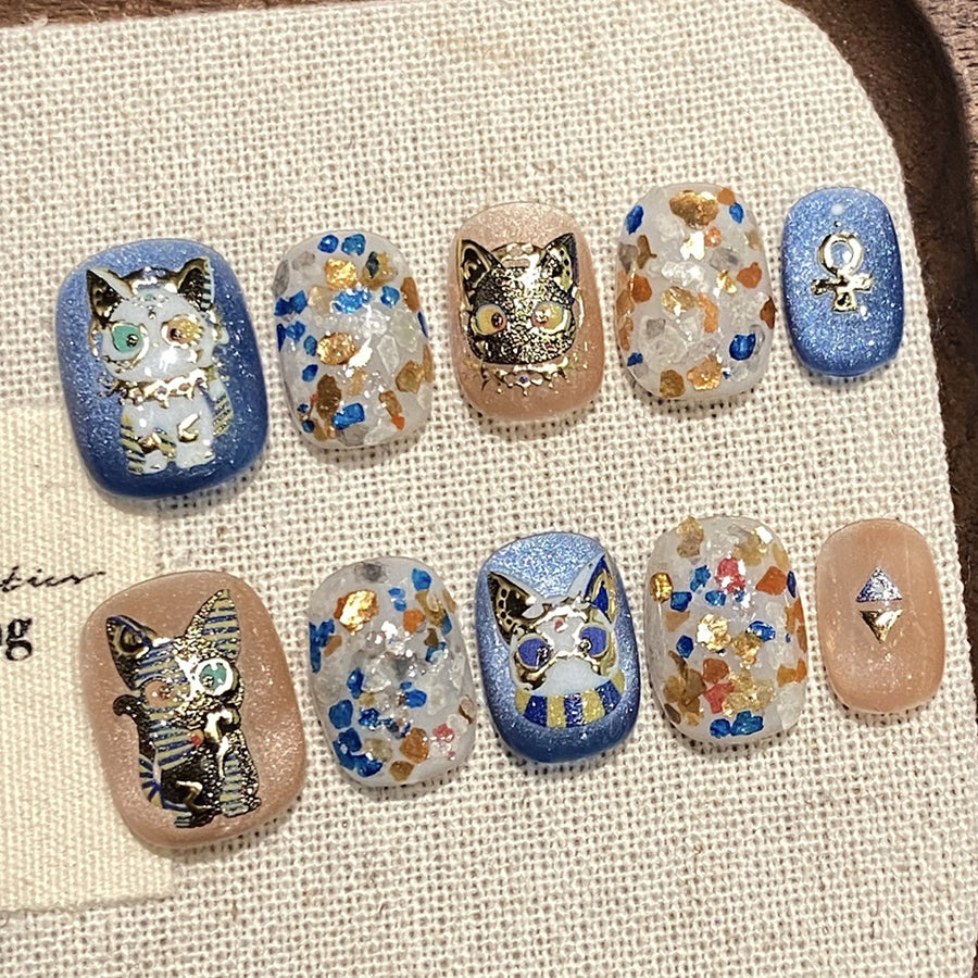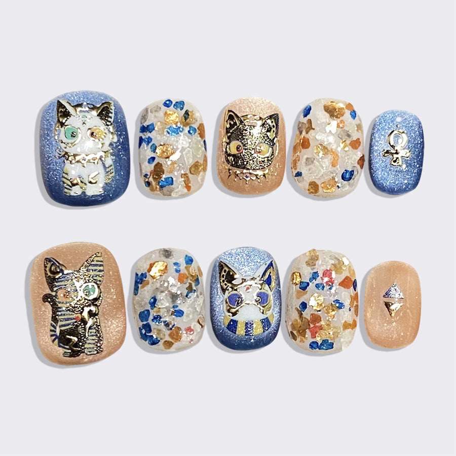 Whimsical press-on nails featuring regal Egyptian cats adorned with hieroglyphs, golden accents, and sparkling gemstones. Each nail blends ancient mystique with playful charm—perfect for those who love bold, artistic designs with a touch of royal magic.