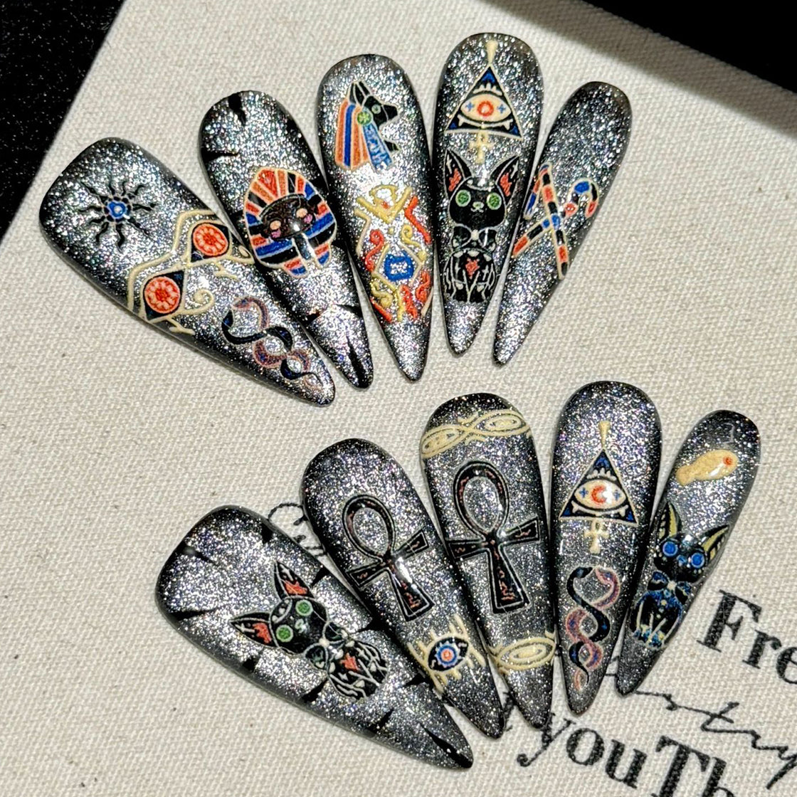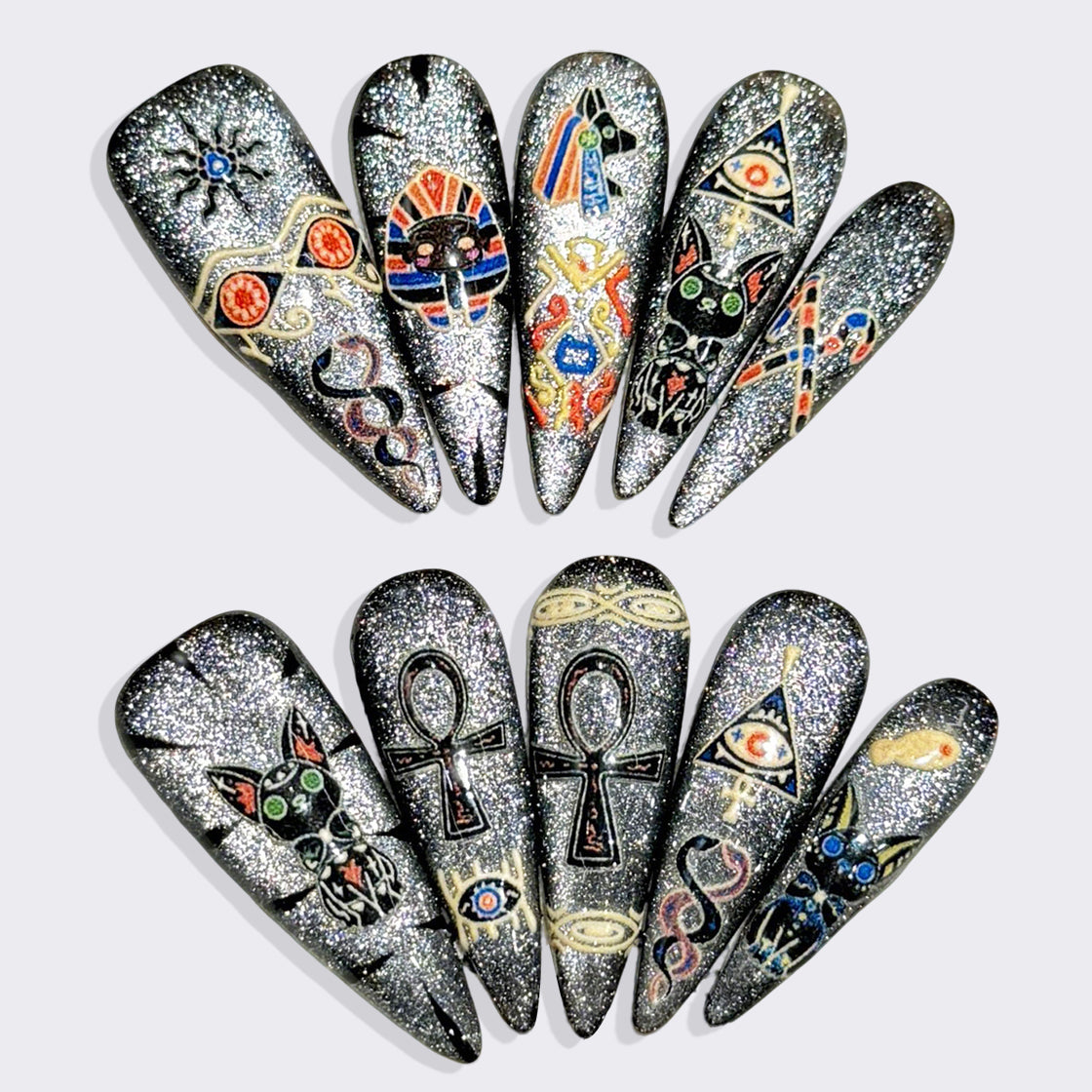 A mesmerizing blend of ancient mysticism and modern glamour, these nails feature a glittering black base adorned with vibrant Egyptian symbols—pharaohs, cats, ankh, and the all-seeing eye. Each stiletto sparkles like starlight over the desert, capturing timeless magic in every detail.