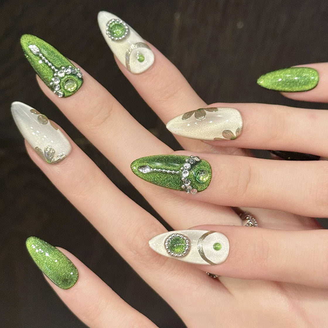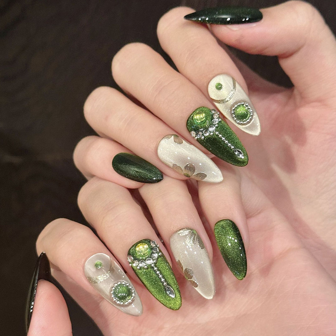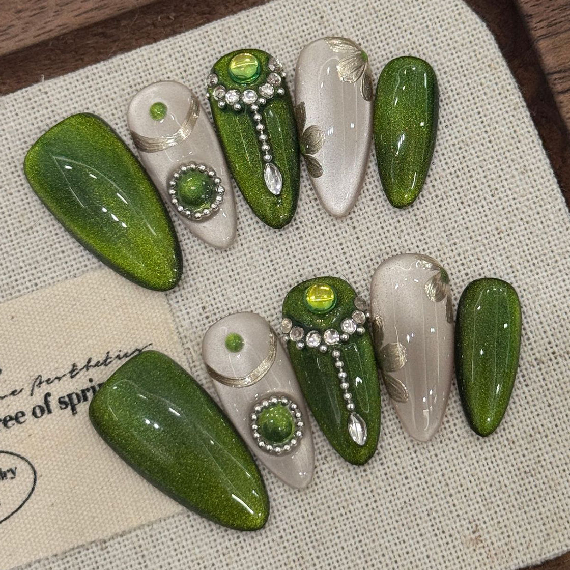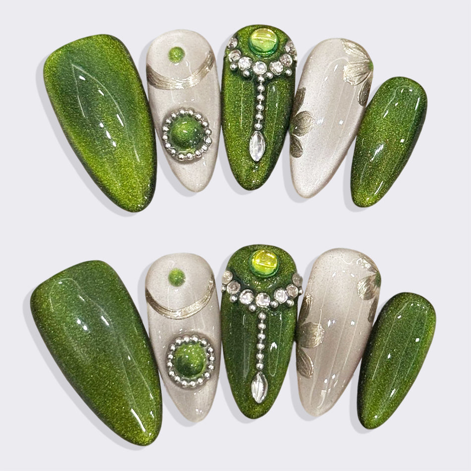 Inspired by the elegance of nature, these press-on nails feature rich emerald greens, shimmering textures, and luxurious gemstone accents. Each nail blends earthy tones with regal details—perfect for adding a touch of refined, forest-inspired glamour to your style.