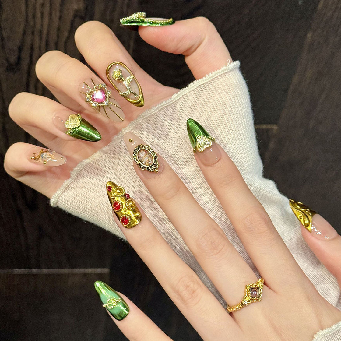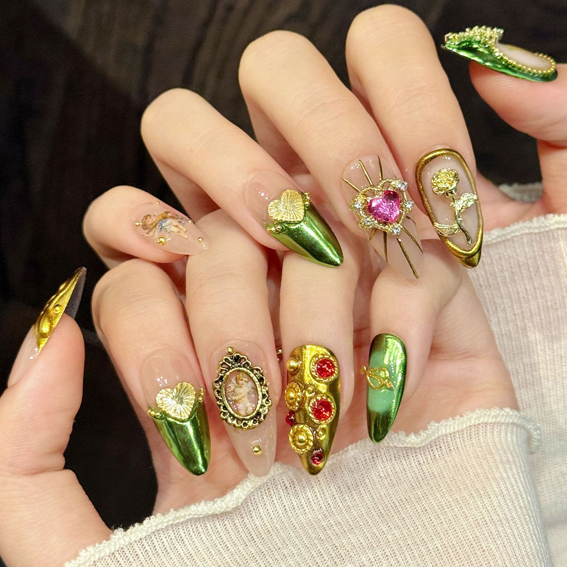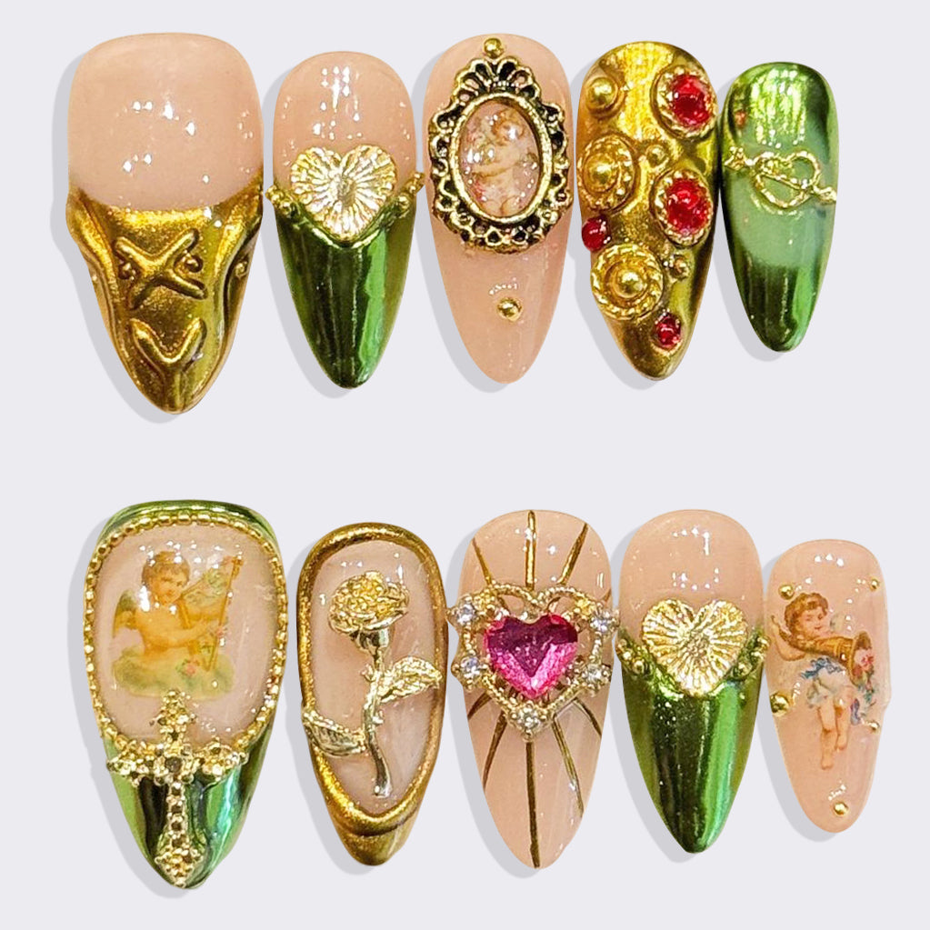 Exquisite nails adorned with vintage angels, golden hearts, and ornate frames in rich gold and emerald tones. This luxurious design blends romantic elegance with divine artistry—perfect for a timeless, enchanting look.
