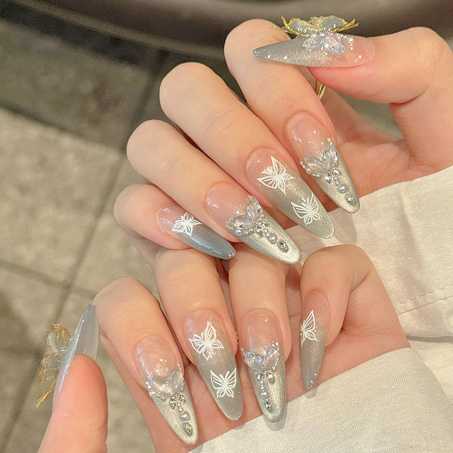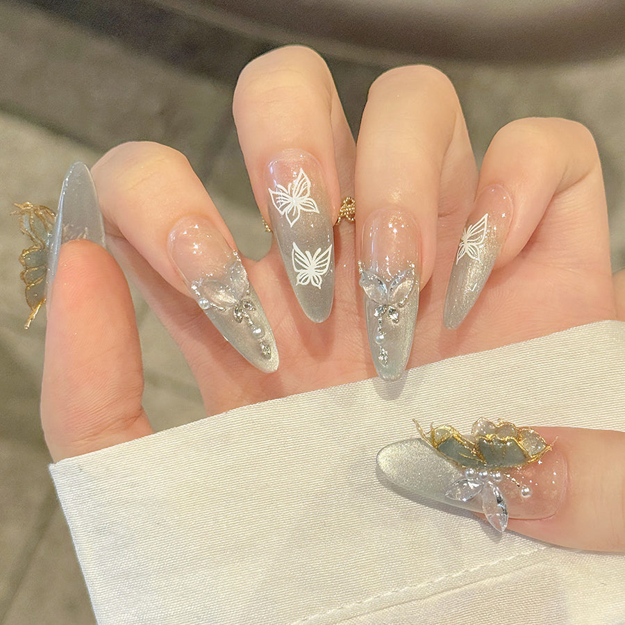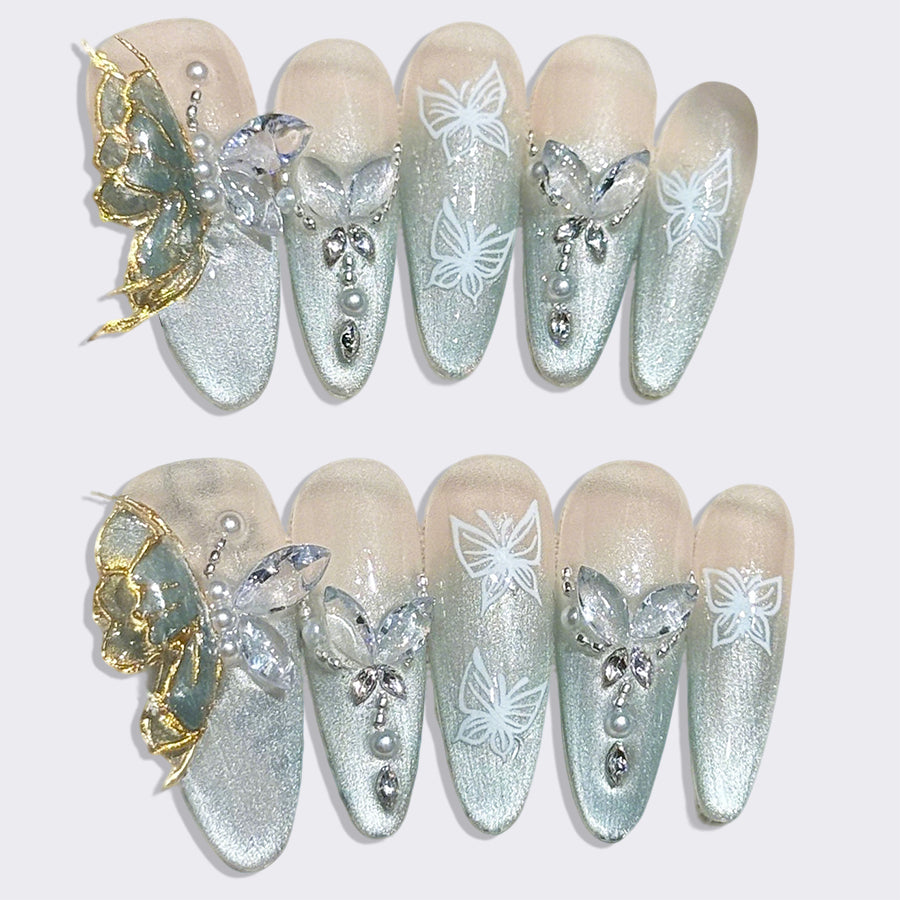 Embrace whimsical elegance with Ethereal Butterfly Dream press-on nails. Featuring 3D butterflies, sparkling rhinestones , and a shimmering icy-blue base, they exude a fairy-tale charm. Perfect for ethereal, romantic styles.