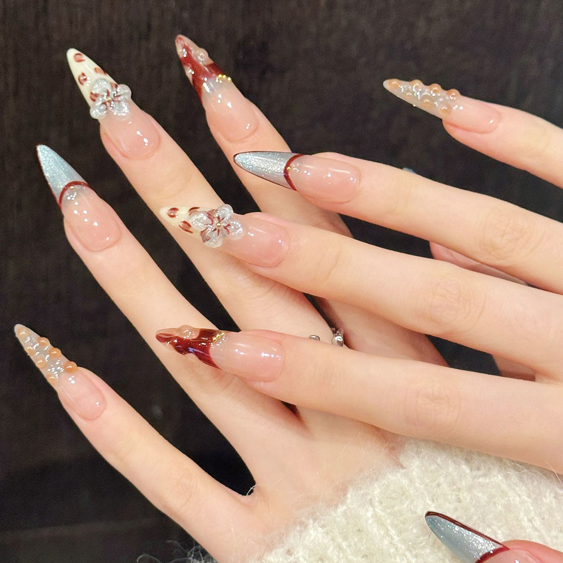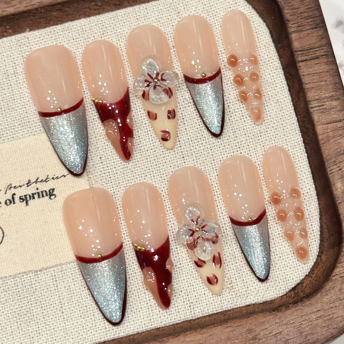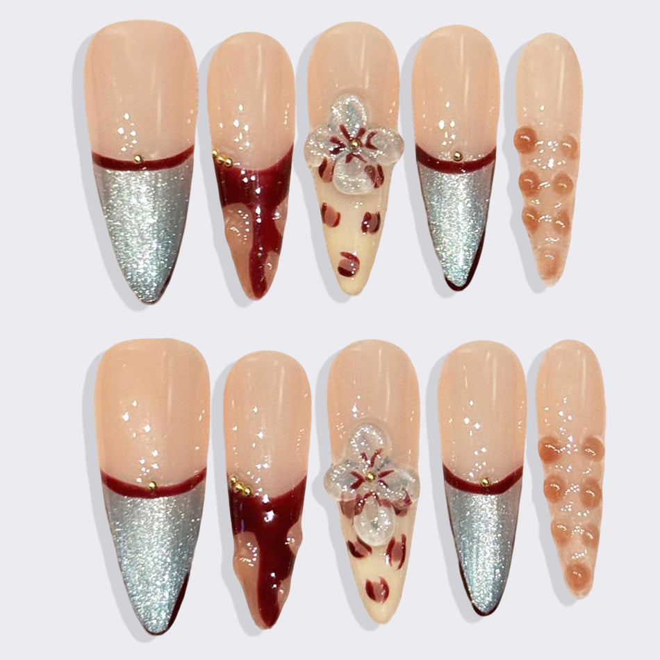 Elegant and artistic, these press-on nails feature a soft nude base with shimmering silver tips, delicate red accents, and 3D floral details. Inspired by morning dew on petals, they blend romance and modern flair—perfect for a sophisticated, feminine look.