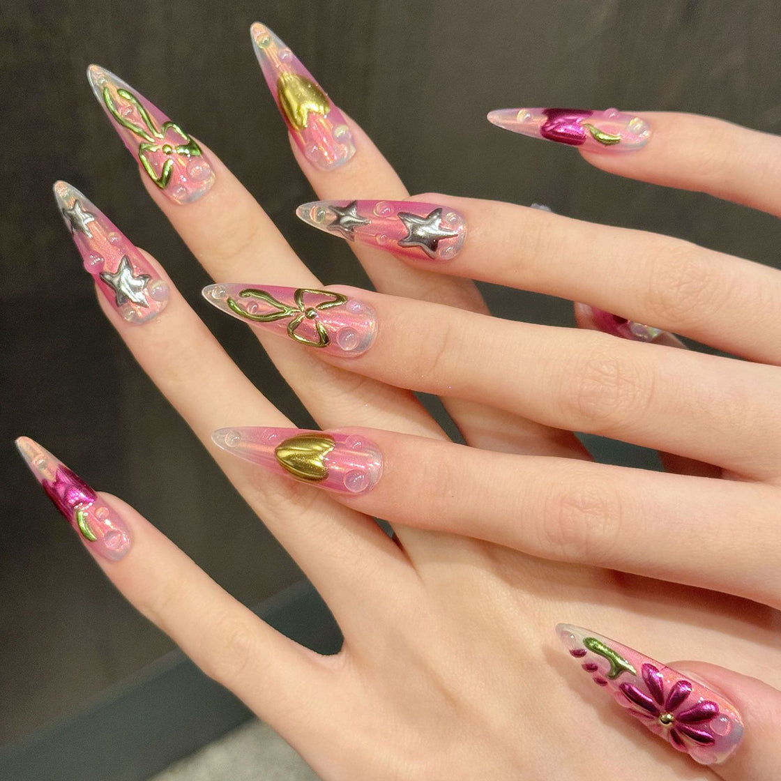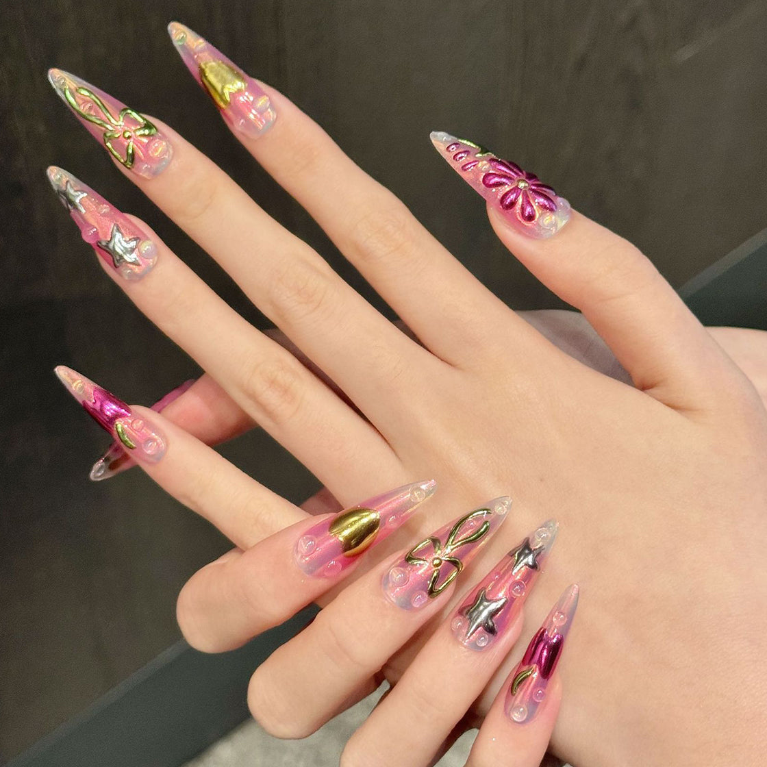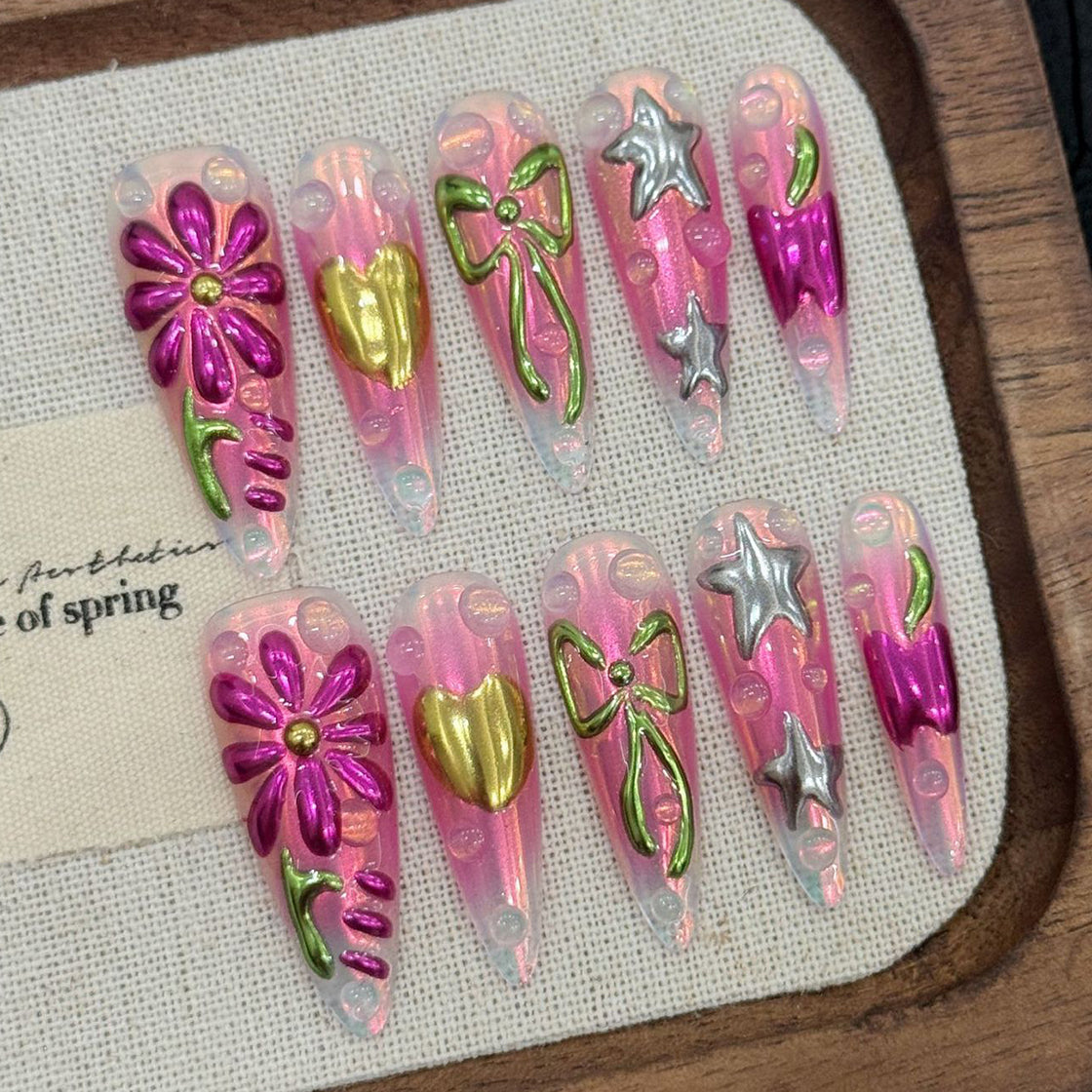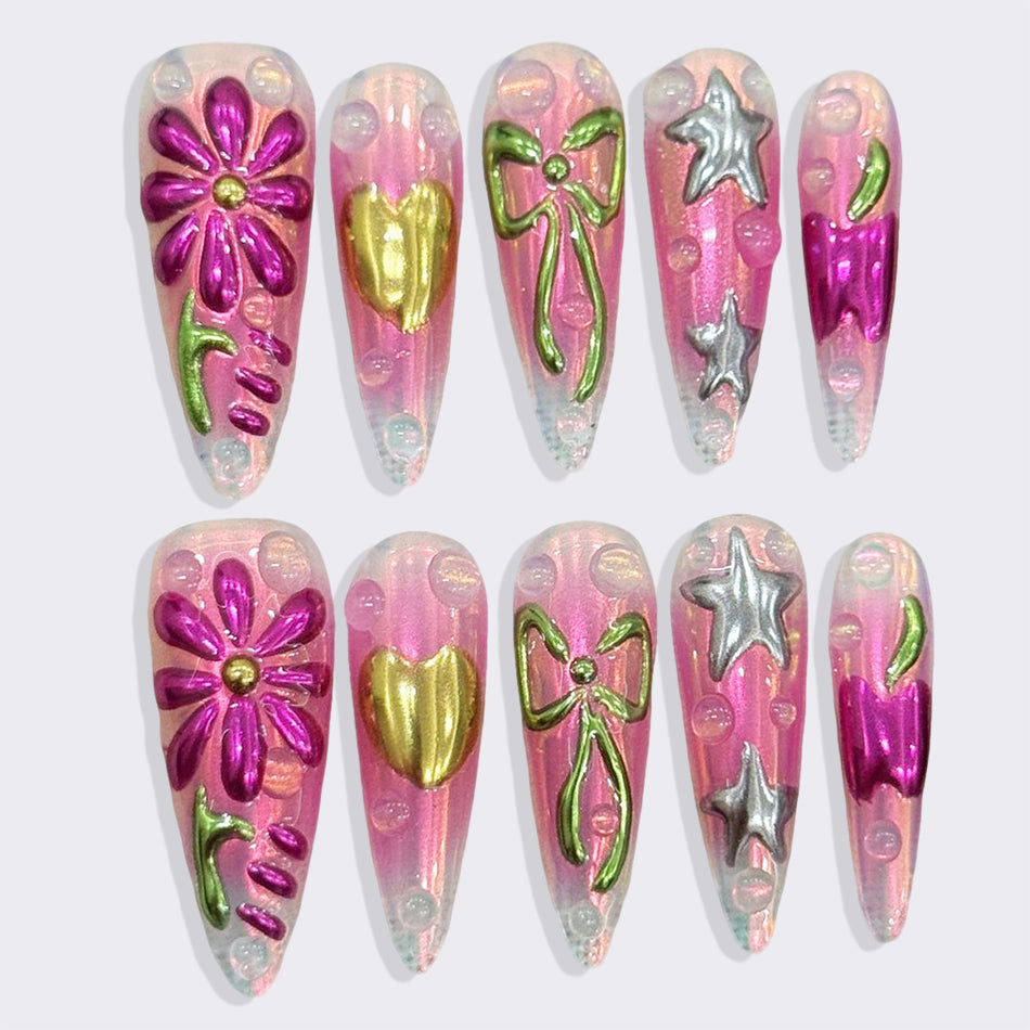 A whimsical blend of iridescent pink, bold 3D flowers, metallic hearts, stars, and bows—each nail sparkles with playful charm. This enchanting set brings a touch of fairy-tale magic to your fingertips, perfect for those who love vibrant, dreamy elegance.