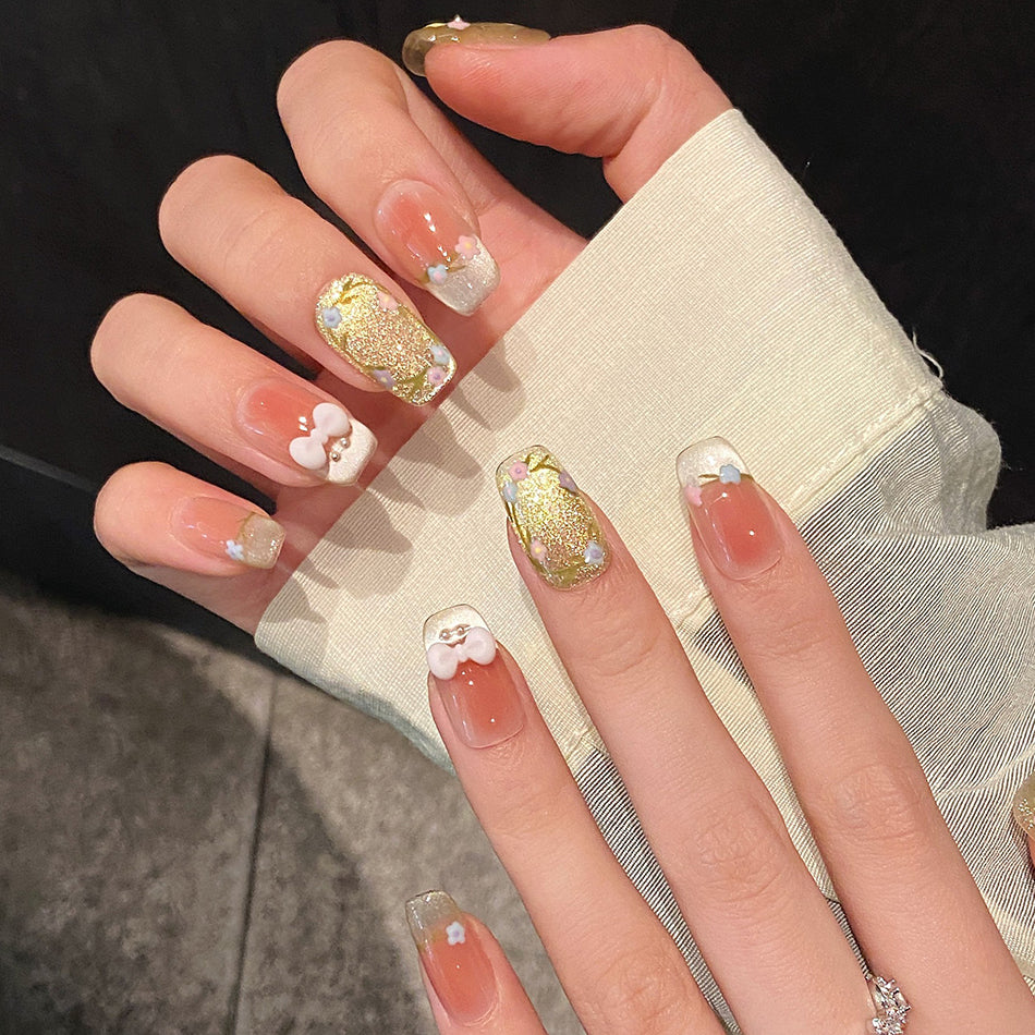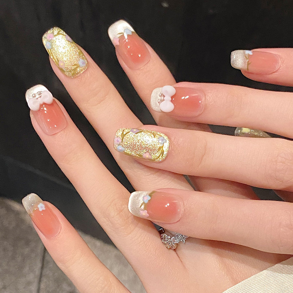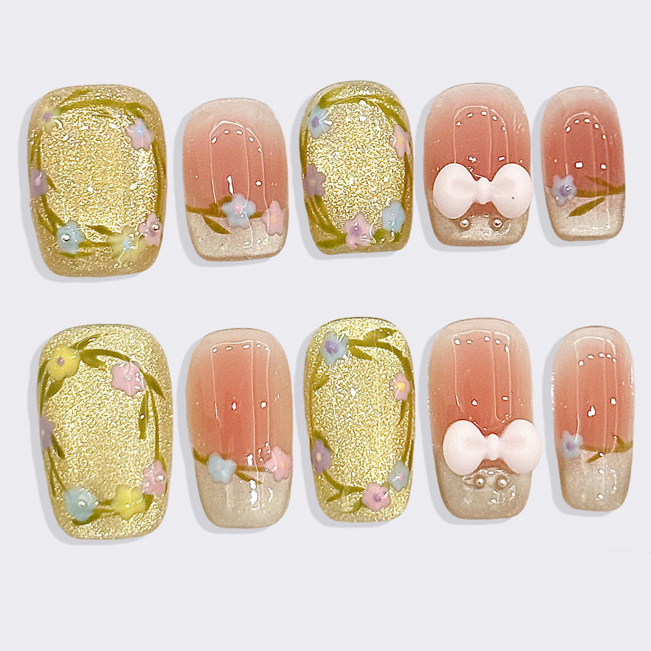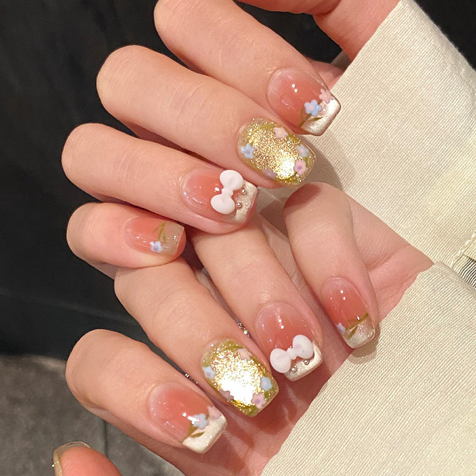 Delicate pastel tones blend with dainty floral accents and a subtle bow, creating a dreamy, feminine look. Lightweight and reusable, these press-on nails offer salon-quality elegance—perfect for everyday grace or special moments that call for soft, romantic charm.