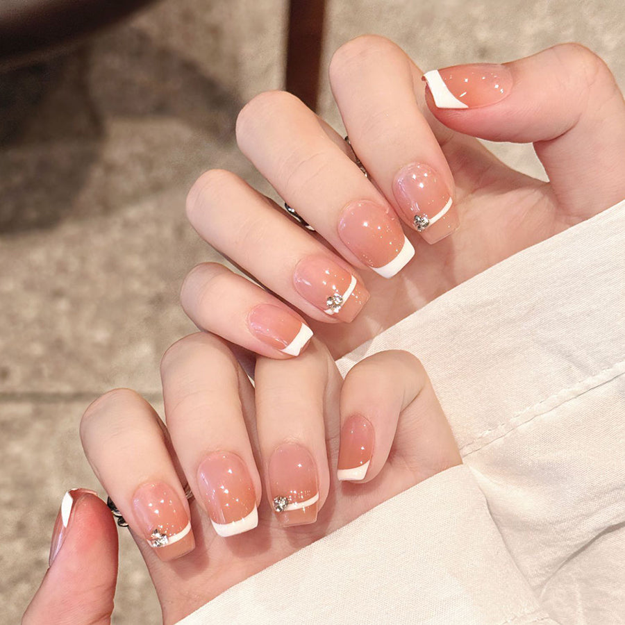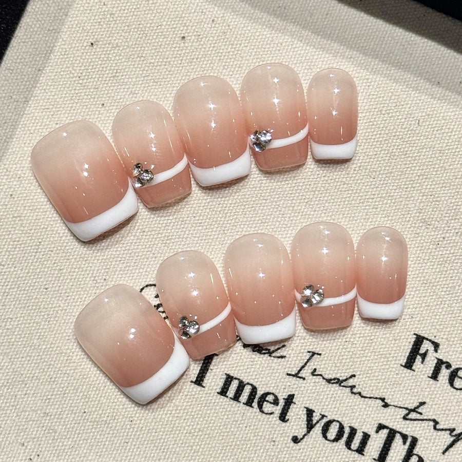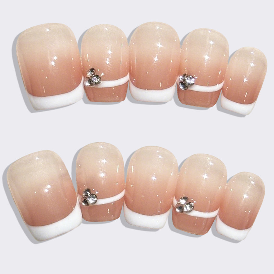 Classic French tip press-on nails reimagined with a luxurious twist—soft blush bases, crisp white tips, and delicate gold or pearl accents along the edges. Elegant, timeless, and effortlessly sophisticated, perfect for every modern woman.