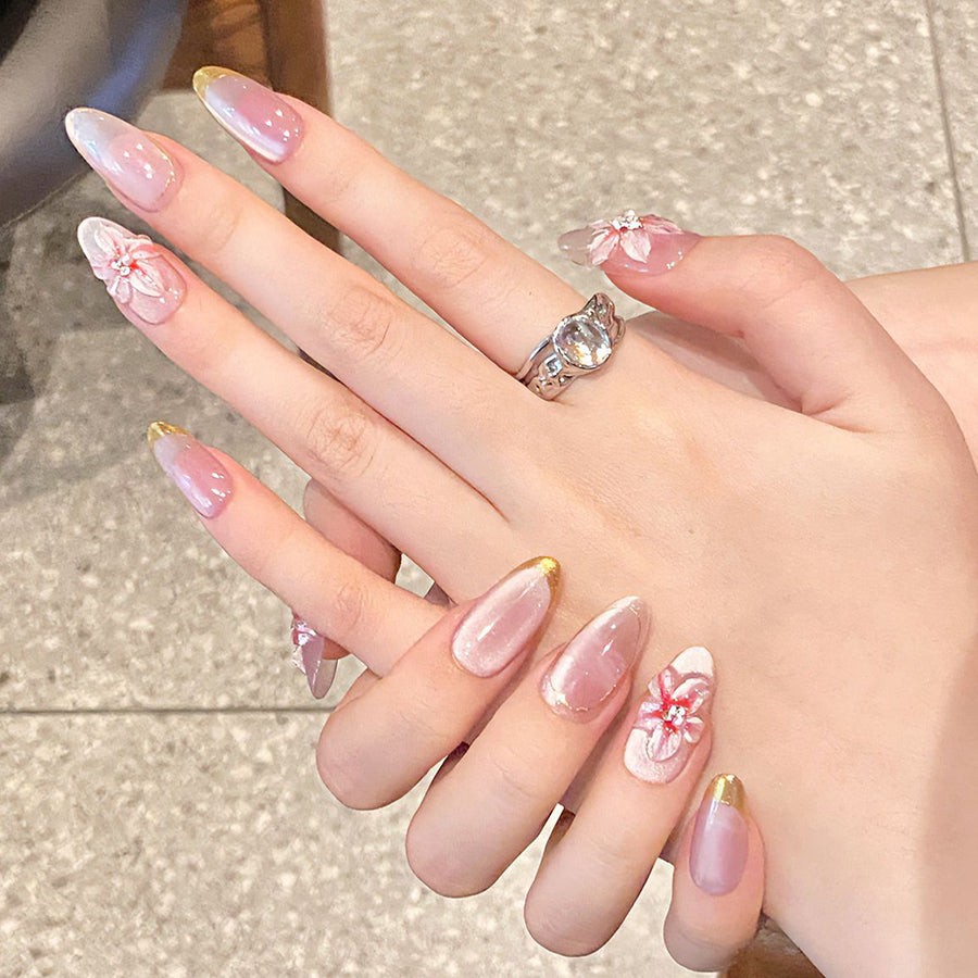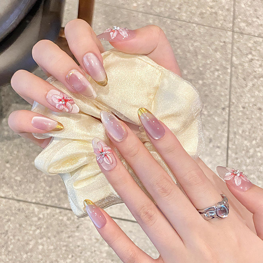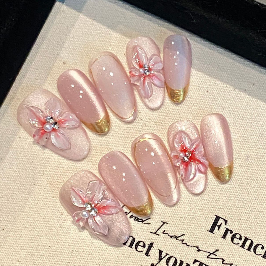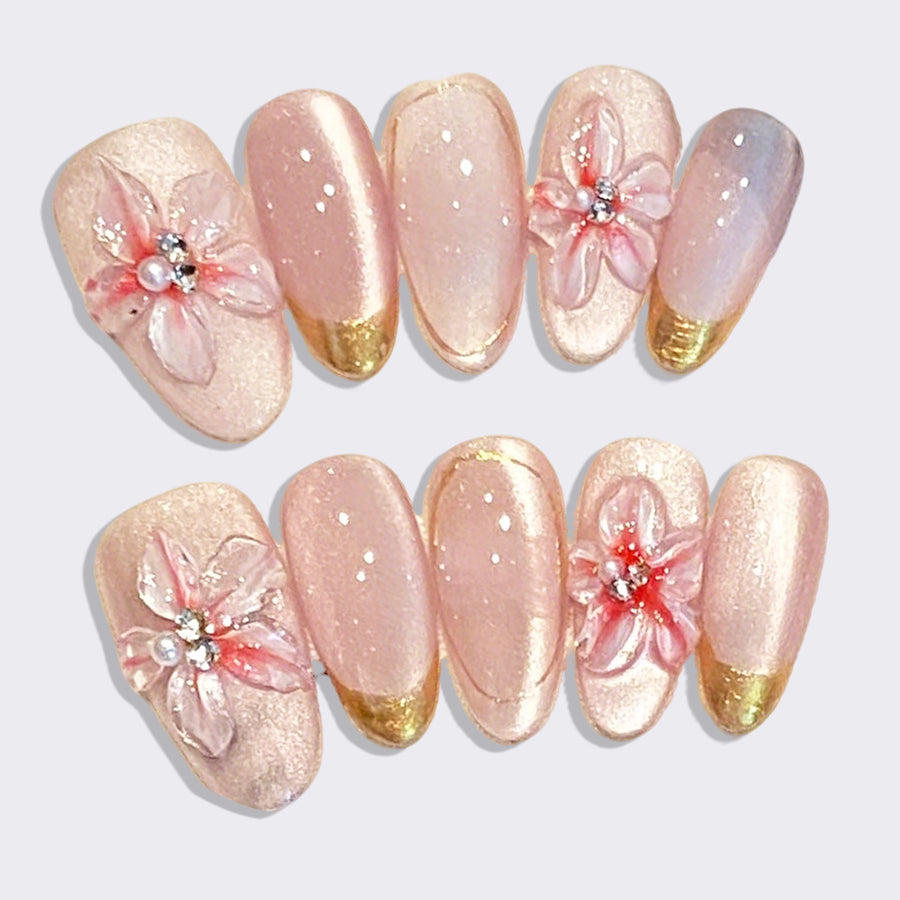 Embrace timeless charm with Garden Dreamscape Elegance press-on nails. Featuring 3D pink flowers, sparkling rhinestones , and gold accents on a blush base, they exude feminine luxury.
