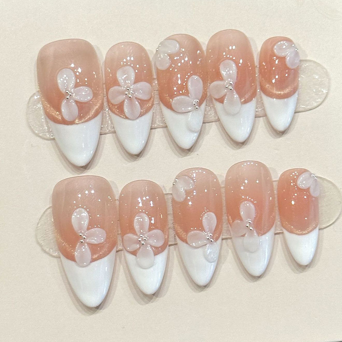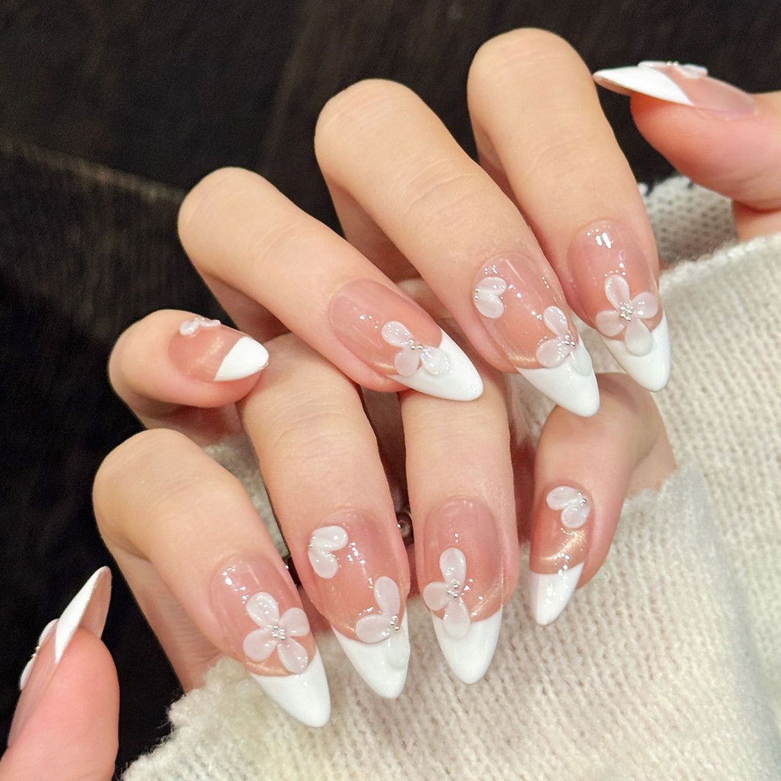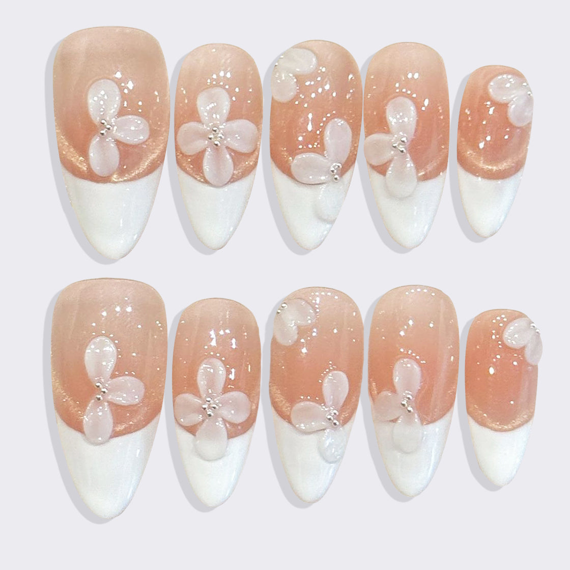 Delicate nude nails with soft white French tips and 3D floral accents, each adorned with tiny beads center. This elegant design radiates feminine grace and subtle charm—perfect for a romantic, refined look.