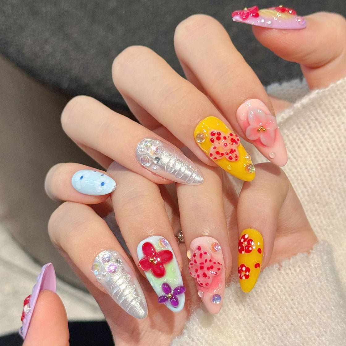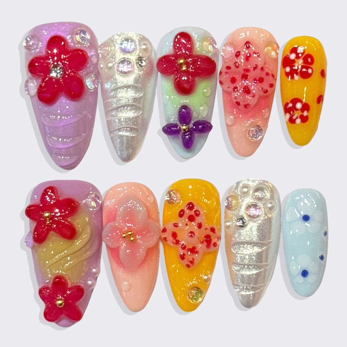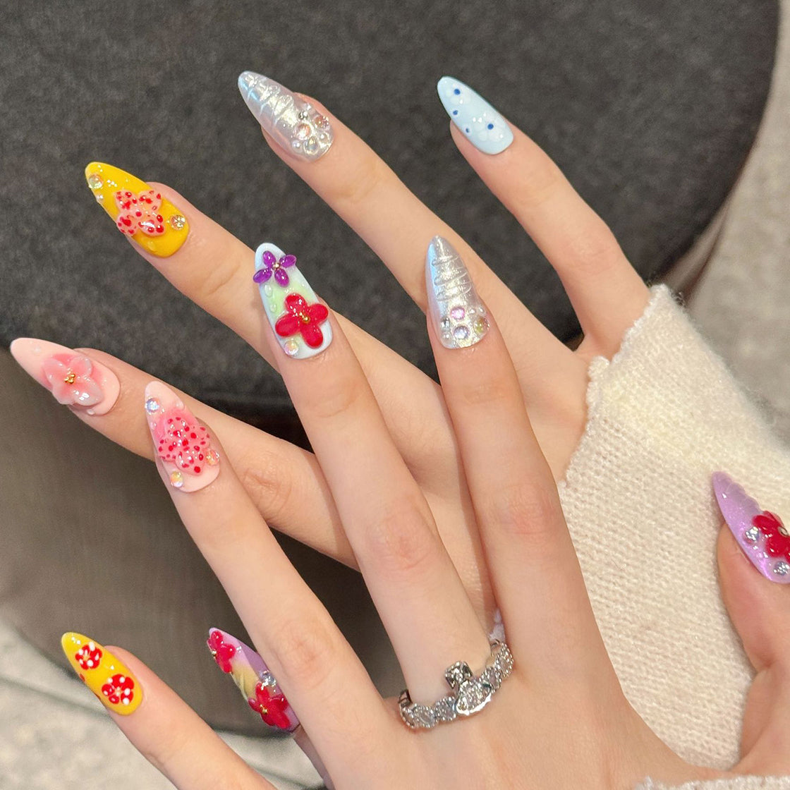 A vibrant explosion of color with bold 3D flowers, shimmering glitter, and iridescent accents on pastel and bright bases. This playful yet elegant set brings joyful energy—perfect for those who love cheerful, eye-catching floral art.