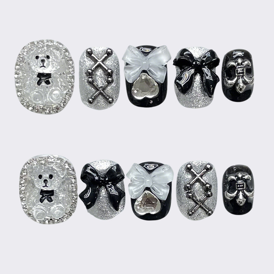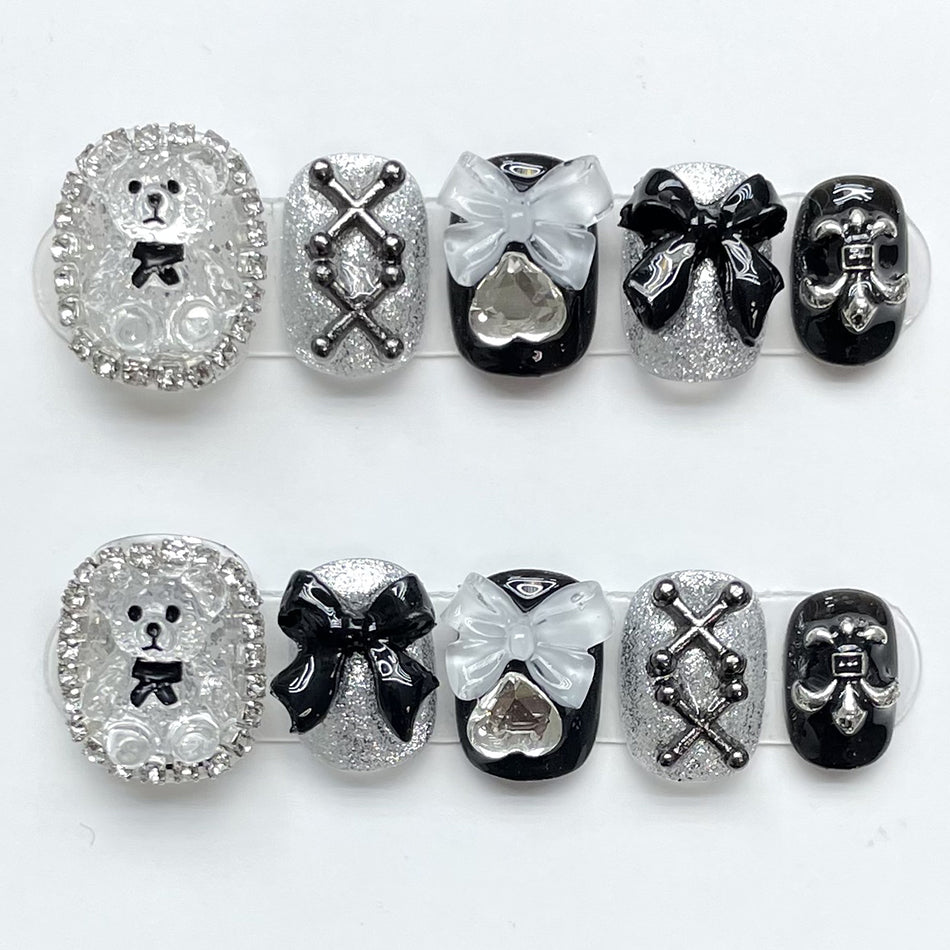 Elegant black and silver nail art featuring a charming bear, sparkling bows, and intricate details. Adorned with glitter, crystals, and delicate patterns, this set exudes luxury and whimsy—perfect for those who love bold, playful glamour.