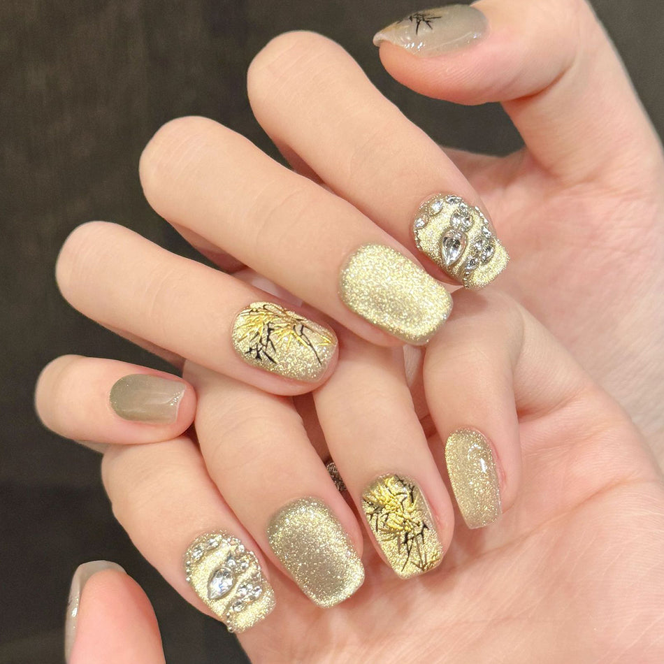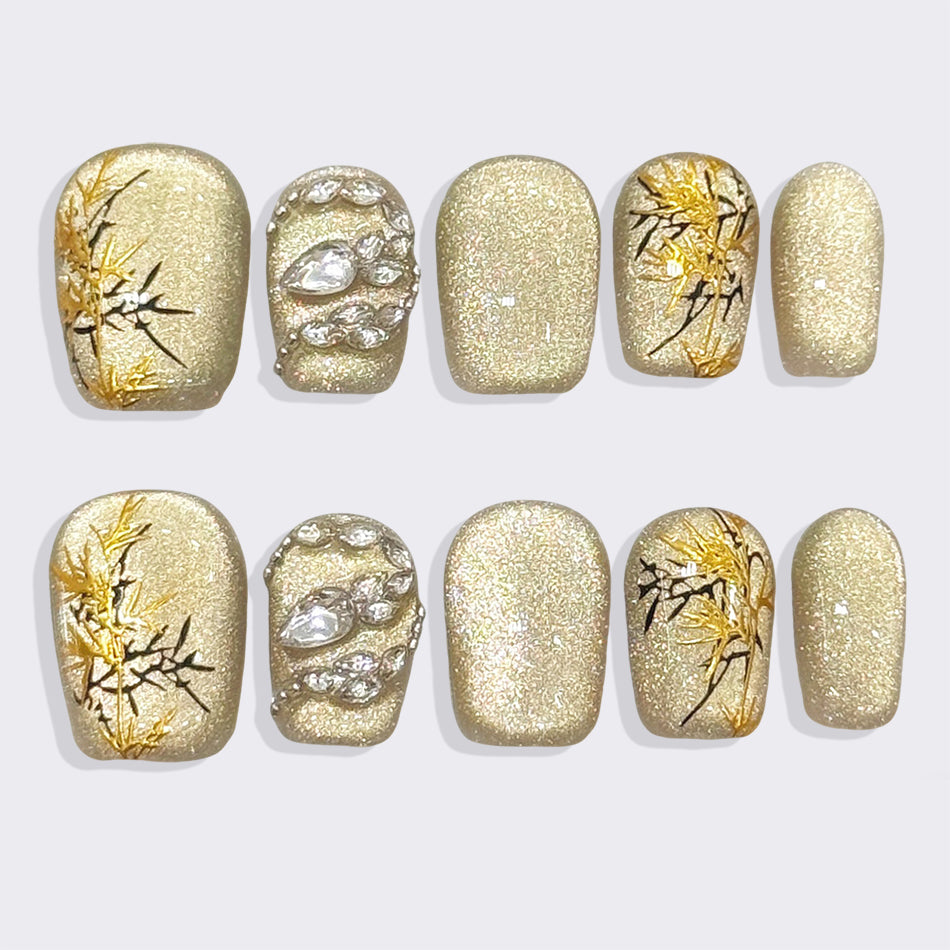 Luxurious gold glitter nails featuring elegant bamboo accents and sparkling rhinestones details. A harmonious blend of Eastern elegance and modern glamour, perfect for those who appreciate refined beauty with a touch of nature’s grace.