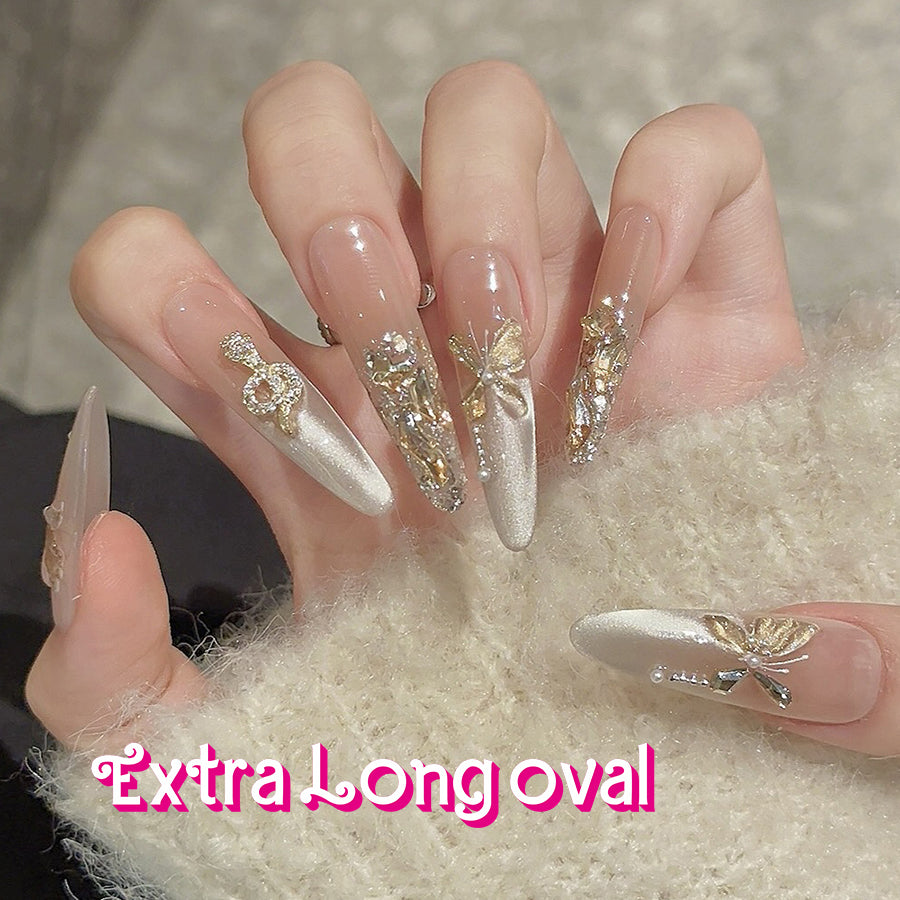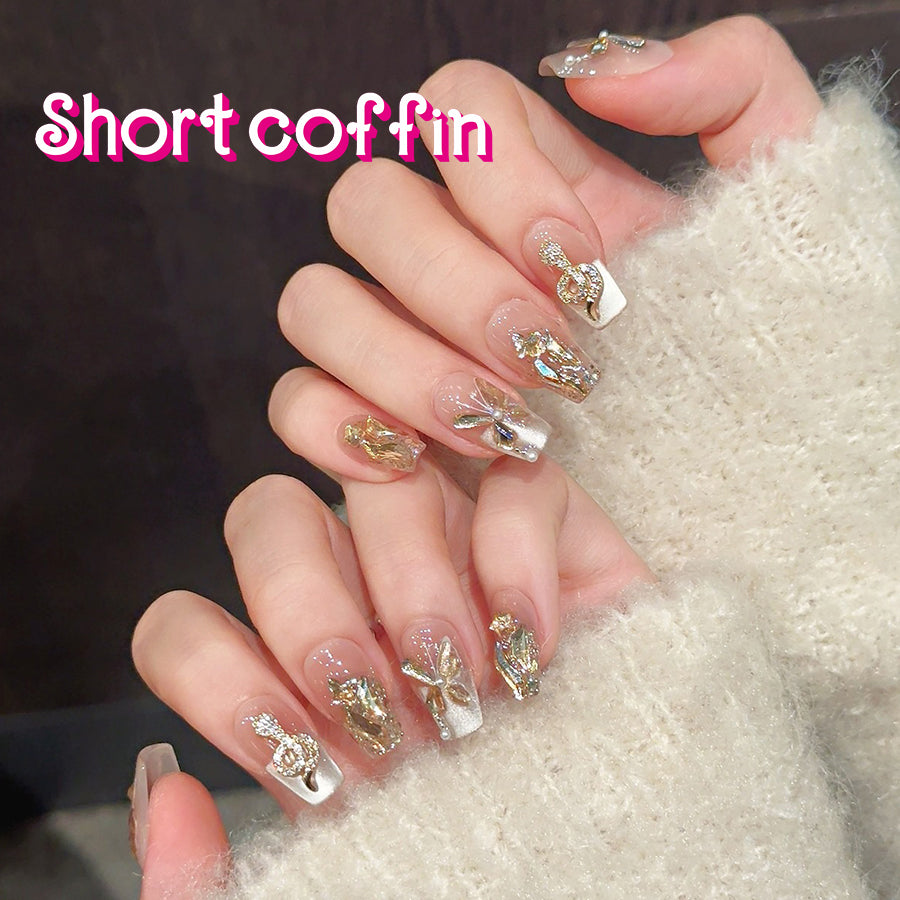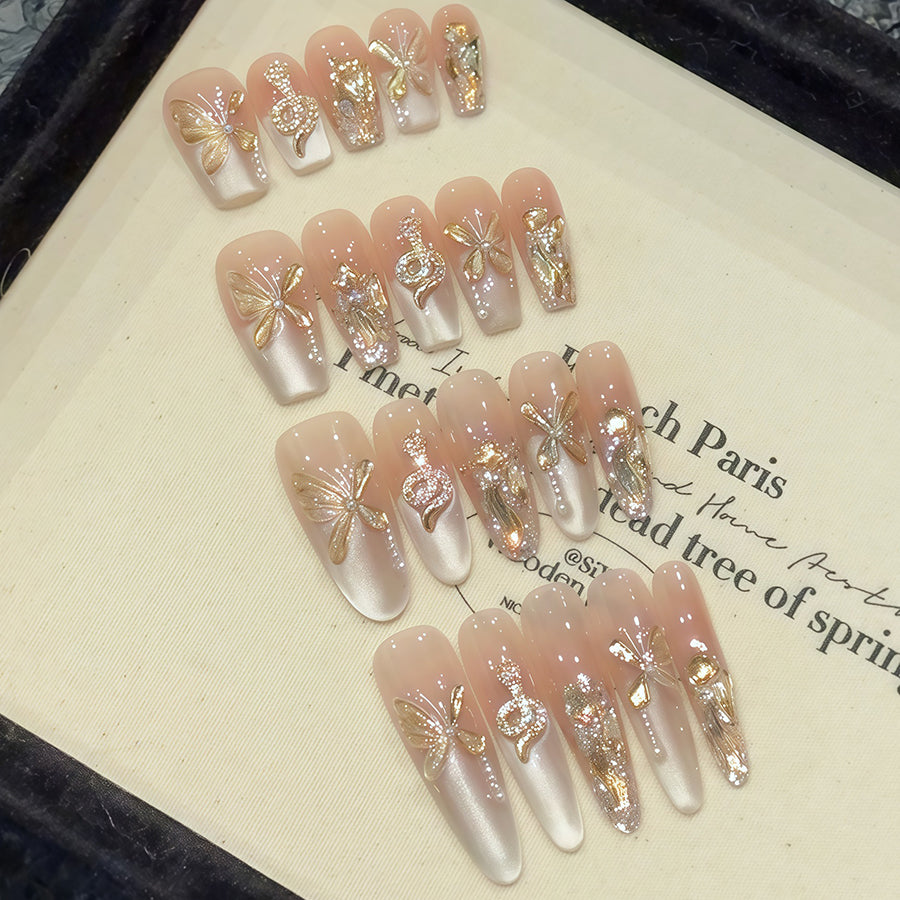Embrace opulent charm with Golden Mythical Elegance nails. Featuring 3D golden butterflies, snakes, and glitter accents on a nude base, they blend mythical allure and luxury. Perfect for glamorous, statement styles.