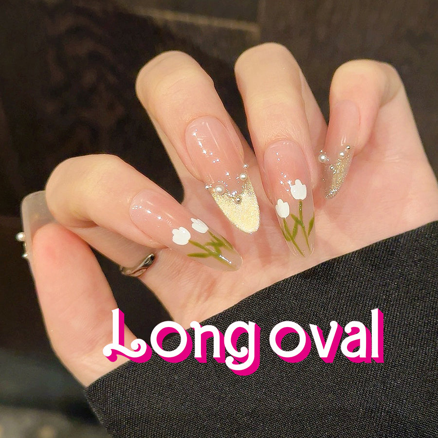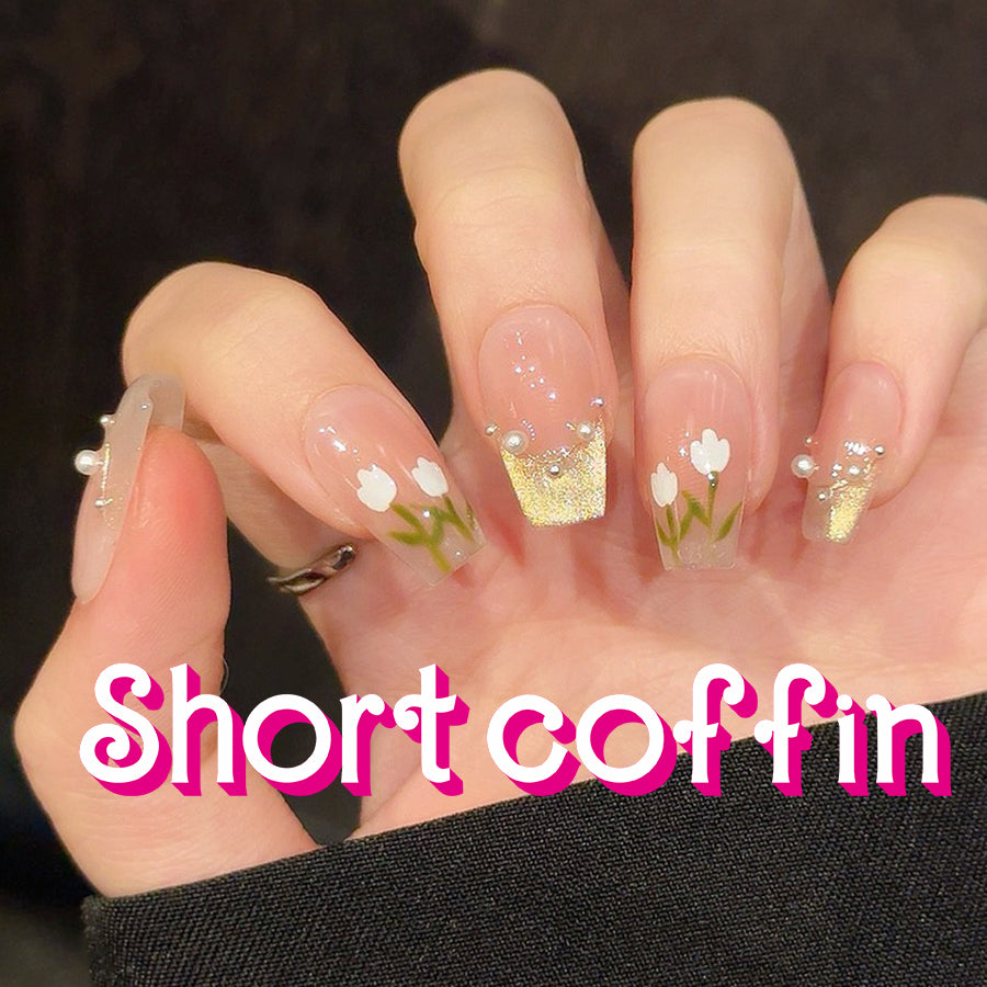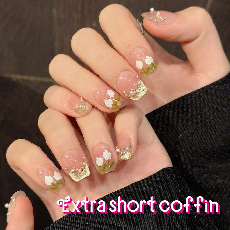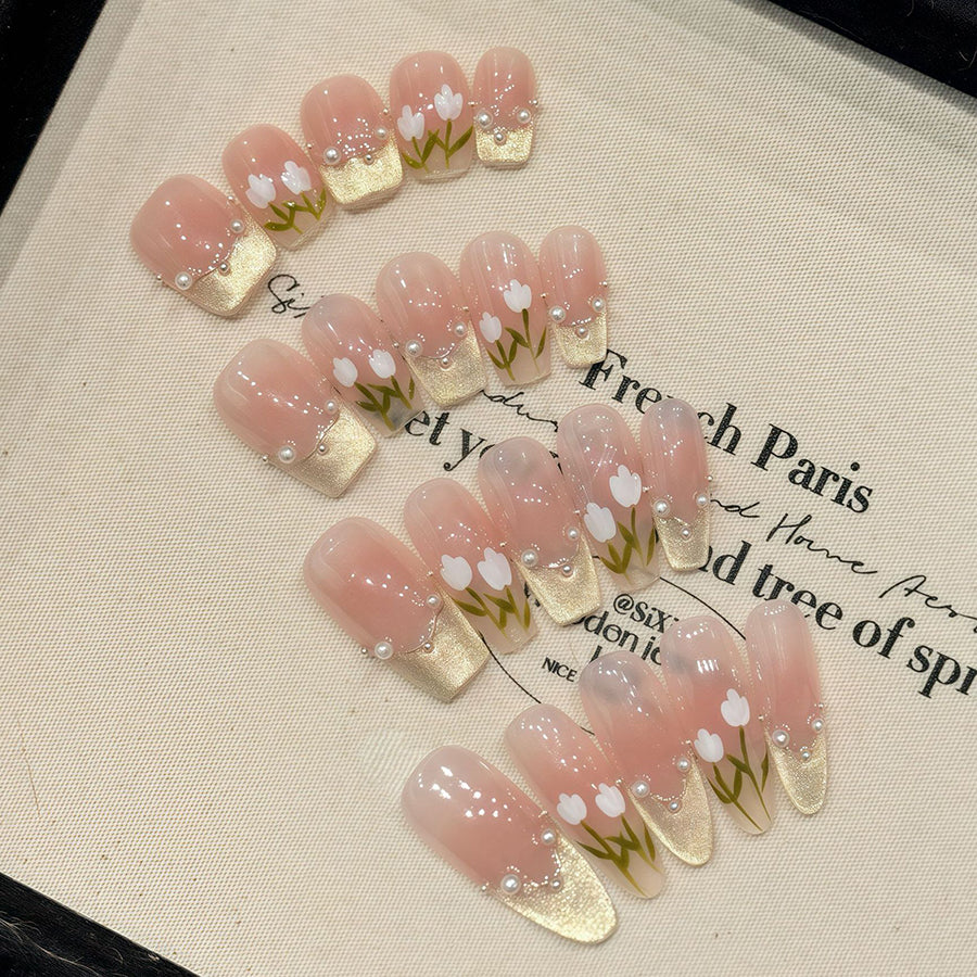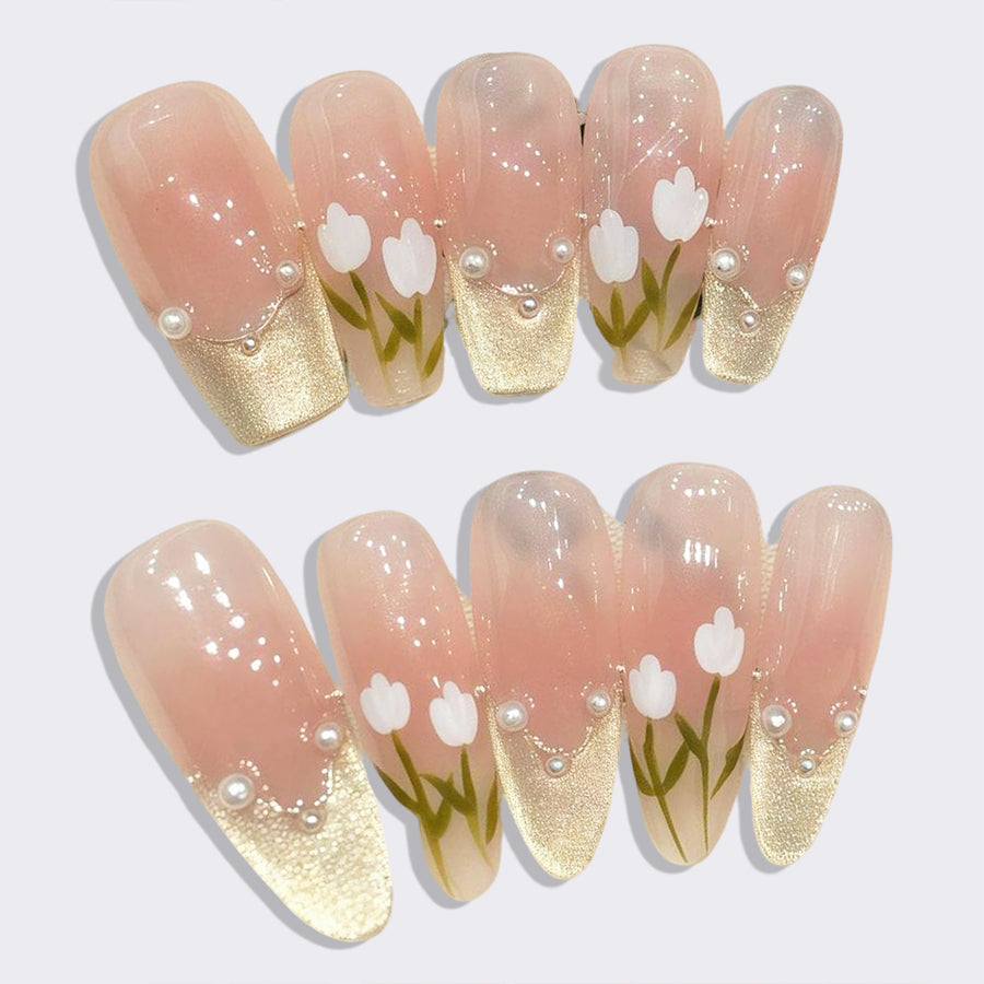 Embrace elegance with Golden Tulip press-on nails. Featuring delicate white tulips, pearl-like beads details, and blush-pink gradients with golden accents, these nails bring a romantic floral charm.