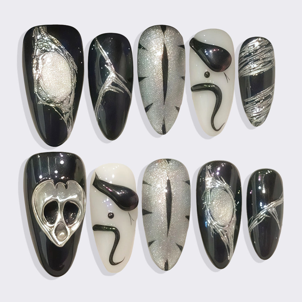A mesmerizing blend of midnight black, shimmering silver, and celestial artistry. Intricate swirls, starry textures, and a mysterious mask design evoke cosmic elegance—bold, artistic, and hauntingly beautiful. Perfect for those who dare to shine in the dark.