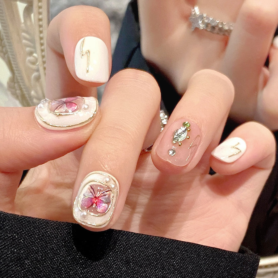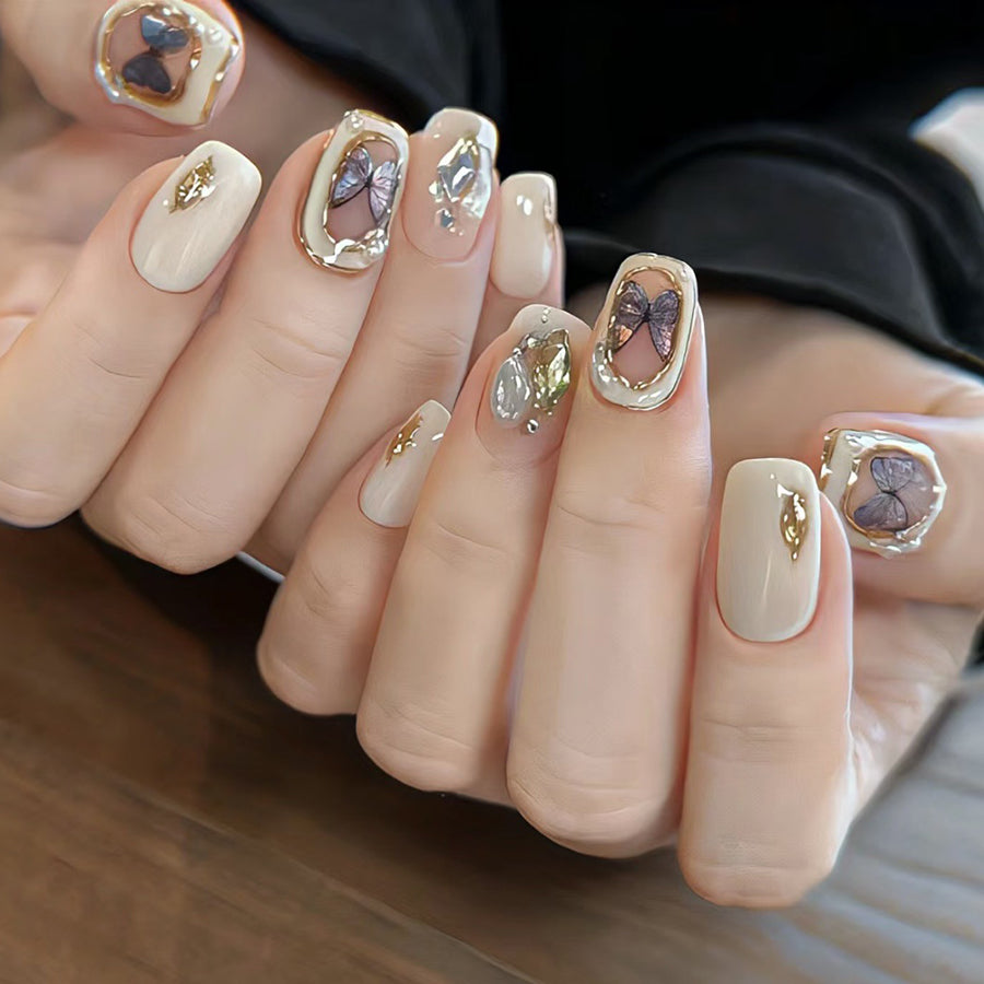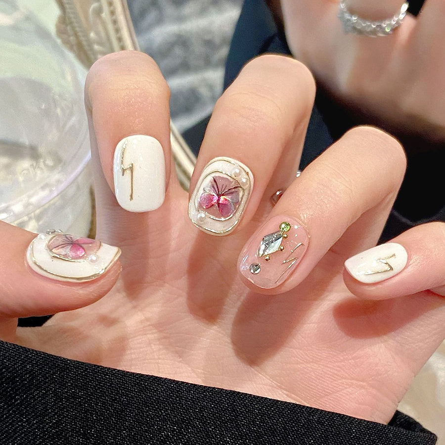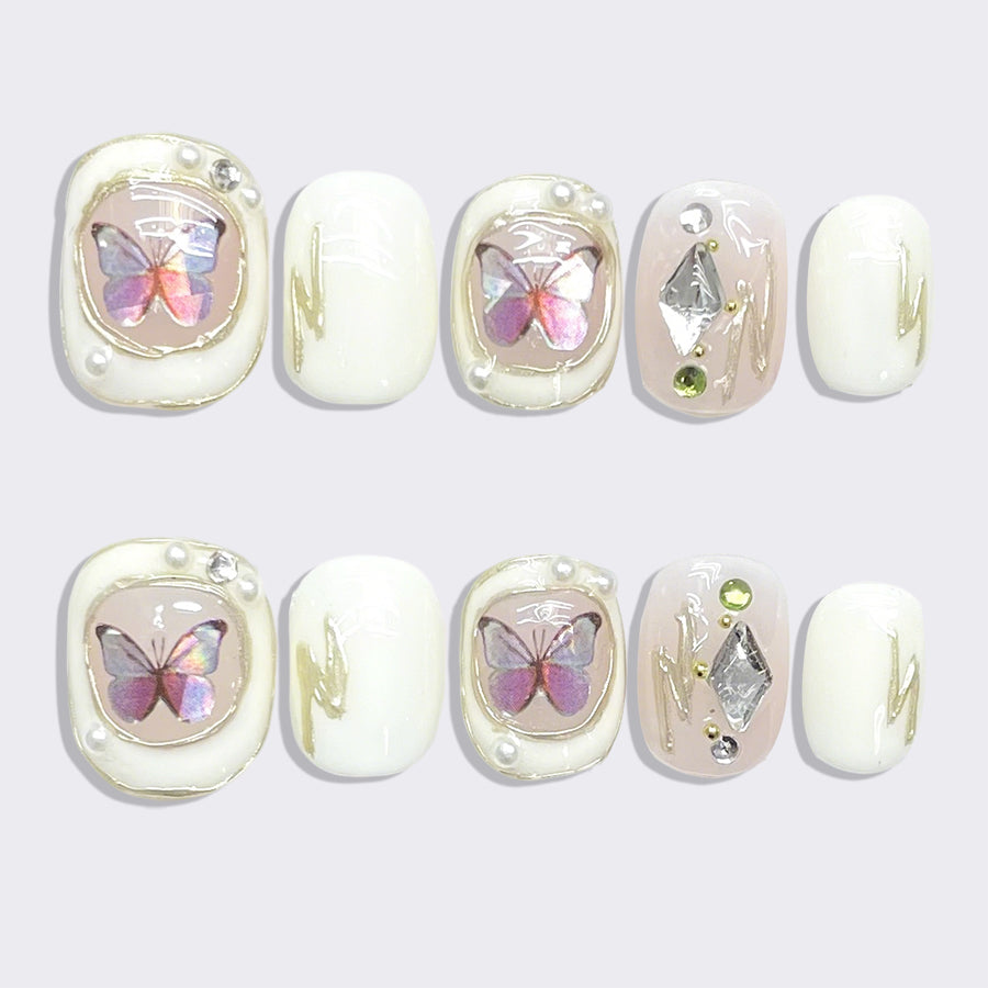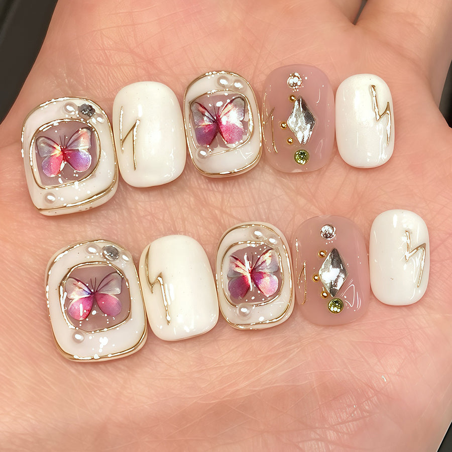 Elegant white nails with iridescent butterflies encased in clear resin, accented by pearls and shimmering crystals. A delicate fusion of nature and sparkle, capturing the magic of a summer breeze in every glance.