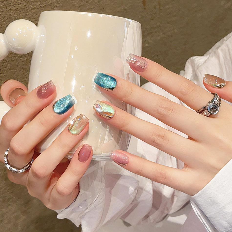 A celestial masterpiece of shimmering iridescence and dreamy hues—each nail shifts from soft pinks to radiant blues, like a galaxy captured in light. With delicate glitter and fluid artistry, these nails evoke the magic of twilight skies and cosmic wonder.