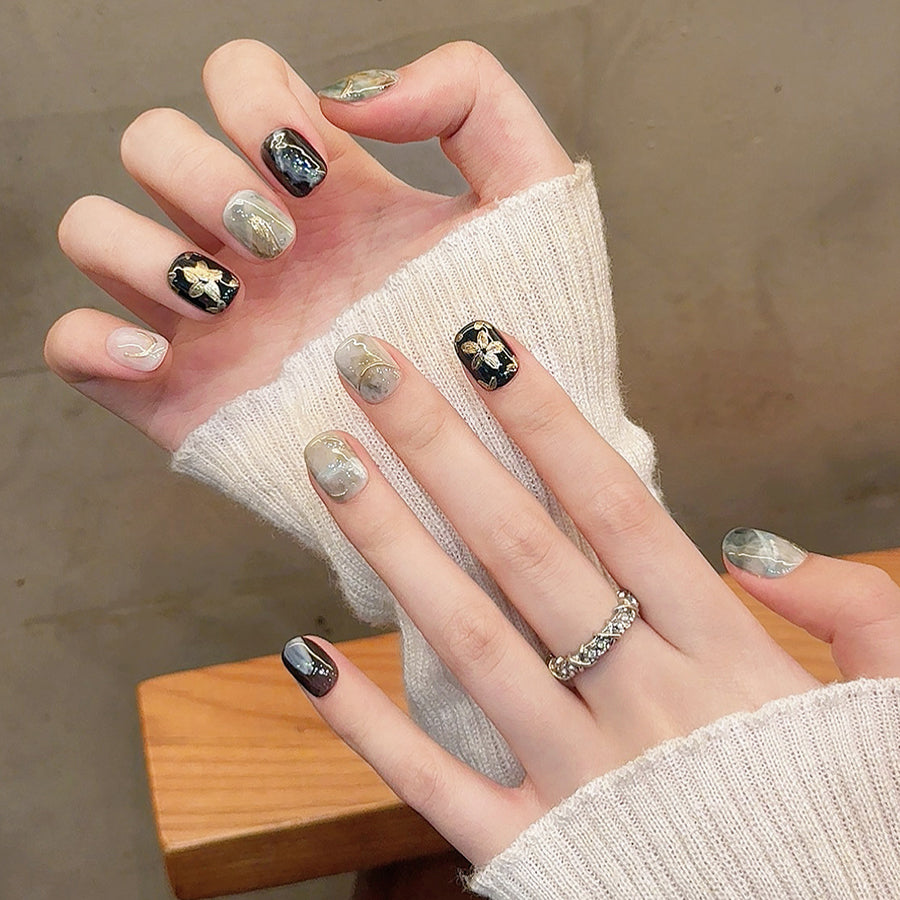 Inspired by natural stone and Eastern artistry, these elegant press-on nails feature soft marble textures, deep blue accents, and delicate gold floral details. A harmonious blend of sophistication and serenity, they bring timeless beauty to your fingertips.