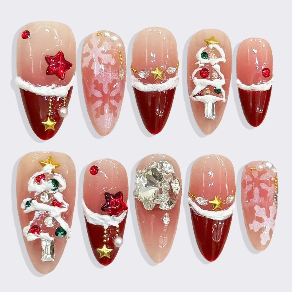 Elegant and festive, these press-on nails feature delicate snowflakes, 3D Christmas trees, and sparkling red stars wrapped in snowy trim. Adorned with crystals and gold accents, they bring the joy of the season to your fingertips—perfect for a glamorous holiday look.