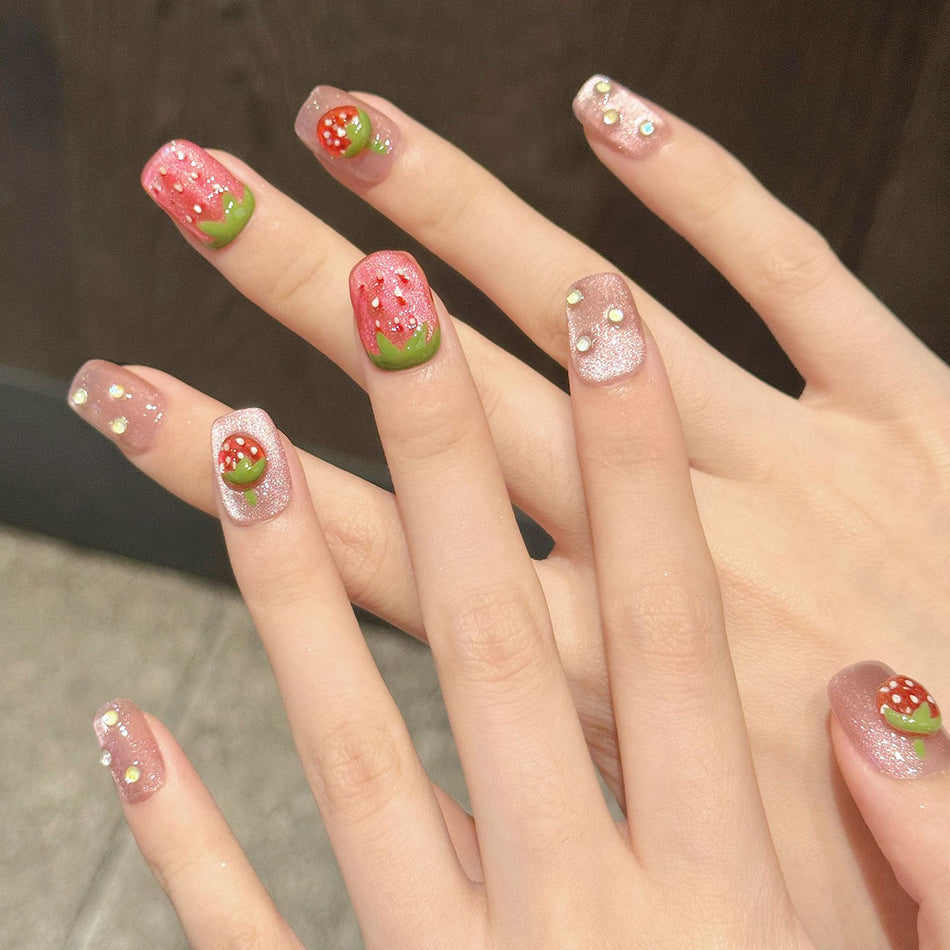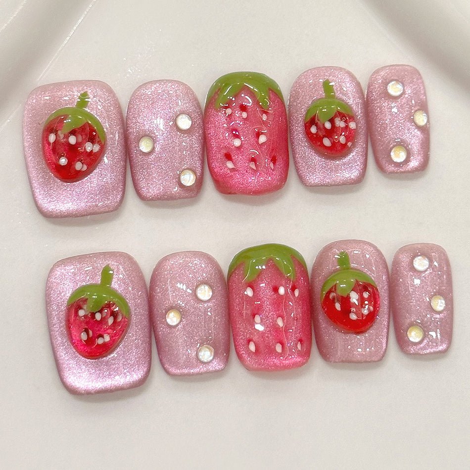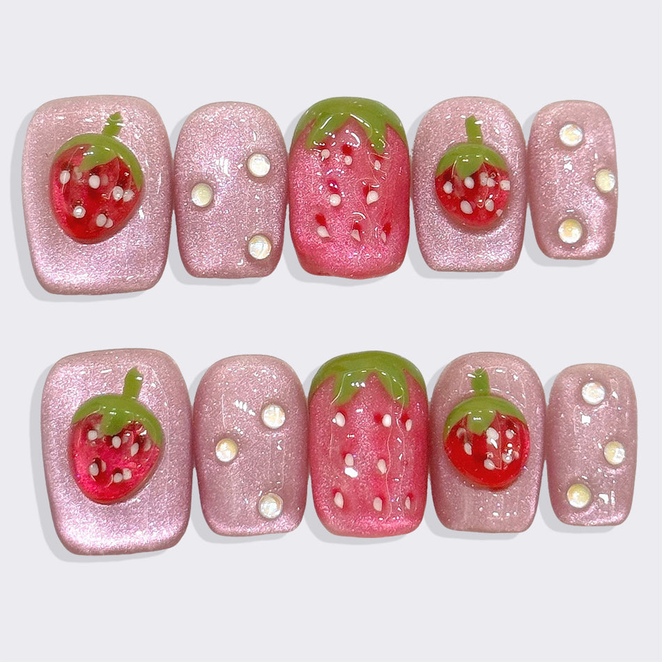 Playful pink nails with glossy 3D strawberry accents and delicate pearl dots. A sweet, vibrant design that captures summer’s joy—perfect for adding a fun, fruity charm to your look with a touch of sparkling sweetness.