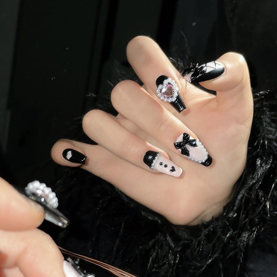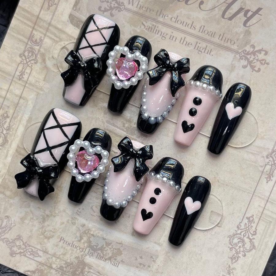 Elegant black and pink nails adorned with pearls, delicate bows, and sparkling hearts. A romantic fusion of vintage charm and modern glamor—perfect for those who love timeless beauty with a touch of drama.