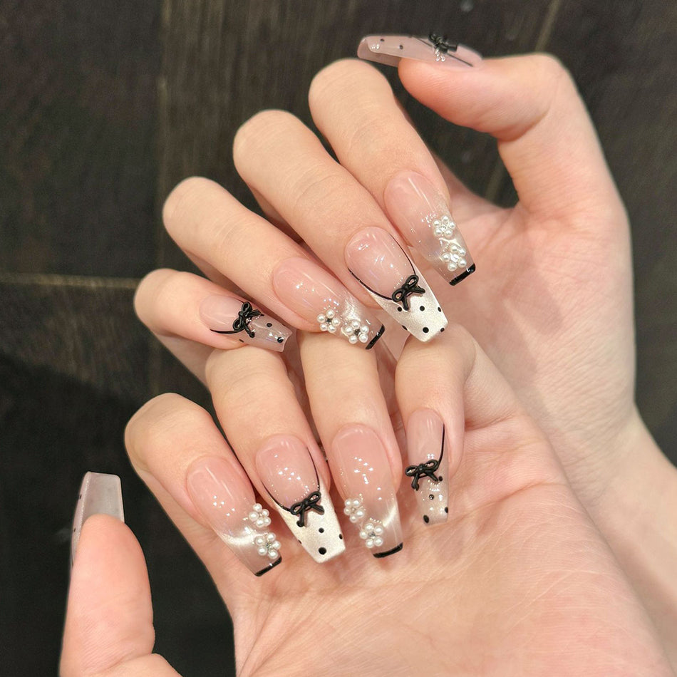 Soft nude tones meet delicate black bows and shimmering pearls in this timeless nail set. With elegant polka dots and a touch of vintage charm, it’s a graceful blend of sophistication and playful romance—perfect for every refined moment.