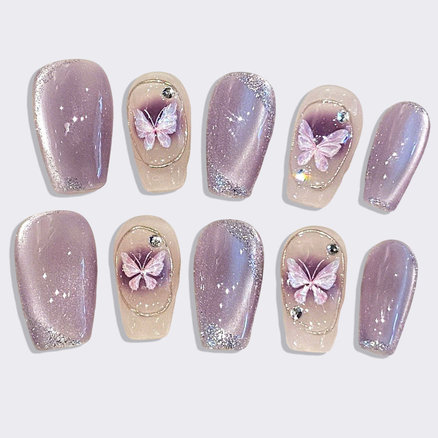 Elegant lavender press-on nails featuring delicate butterfly designs and sparkling glitter, like stars scattered across a dreamy night sky. Each nail shimmers with ethereal beauty, bringing a touch of magic and grace to your fingertips.