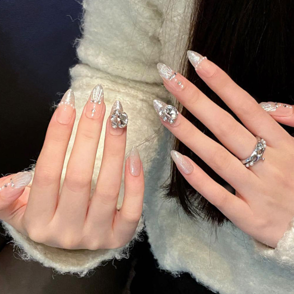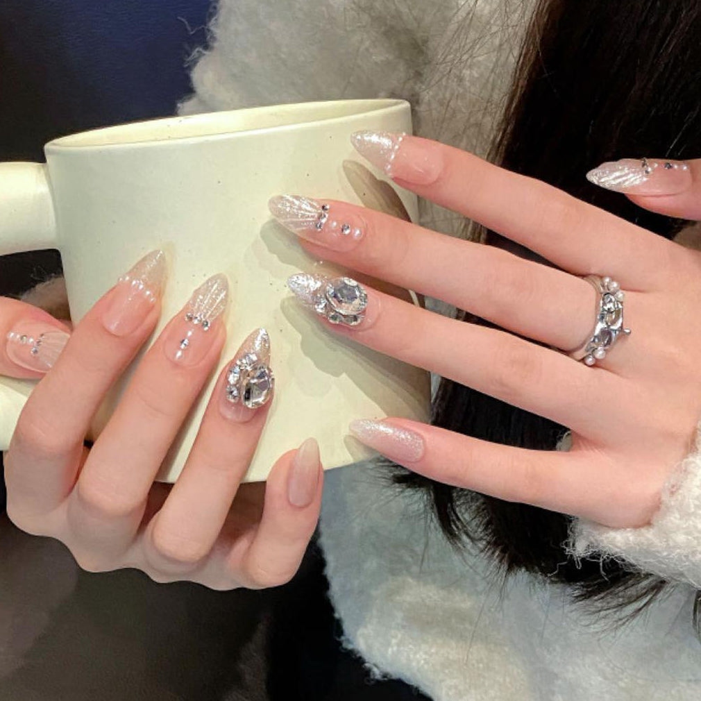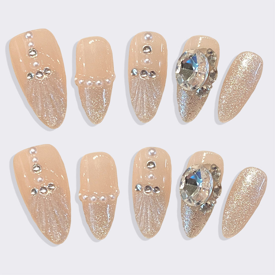 Elegant and radiant, these press-on nails feature a soft nude base with shimmering glitter and delicate pearl accents. A dazzling crystal centerpiece adds a touch of luxury, while subtle textures evoke the glow of moonlit dew. Perfect for elevating any look with understated glamour.