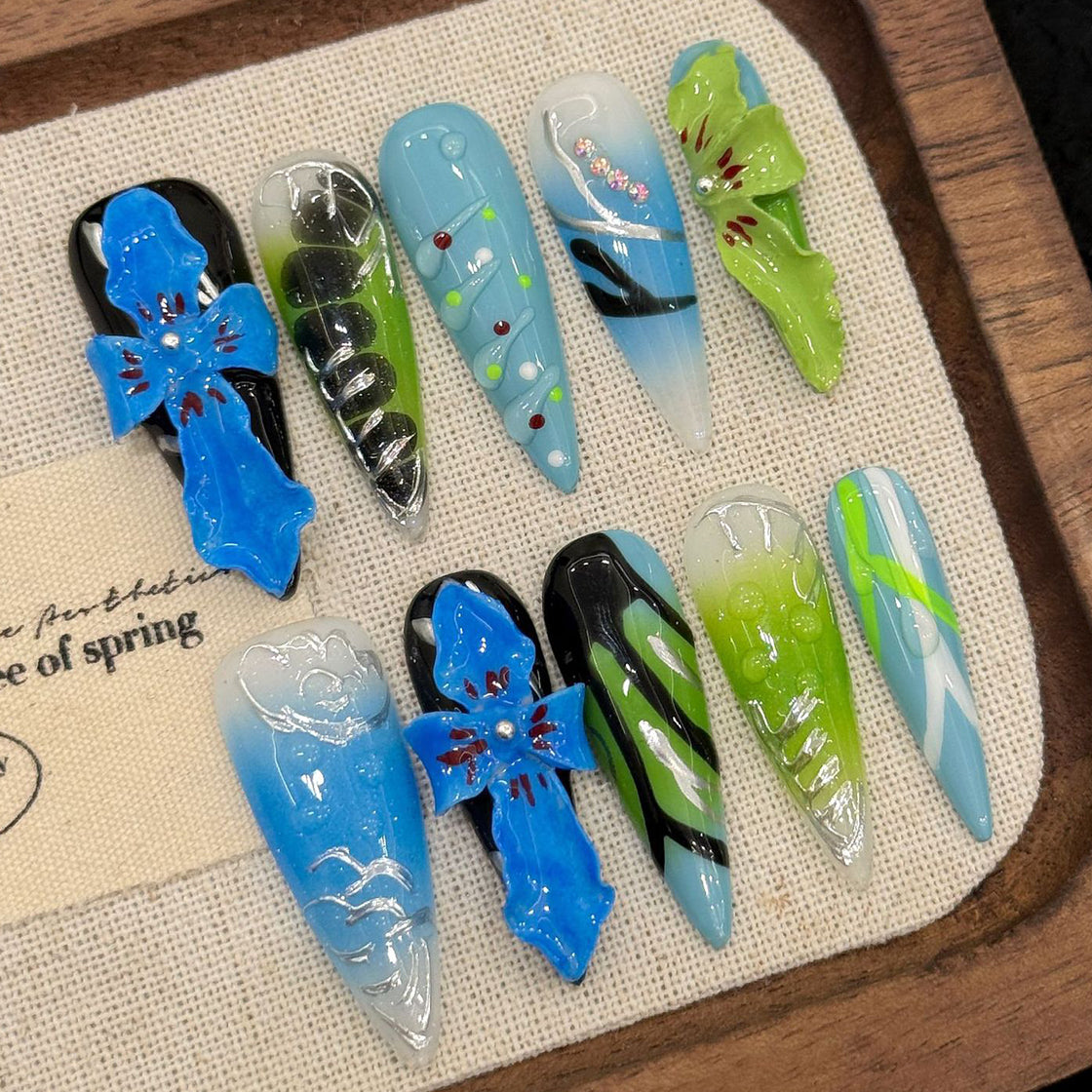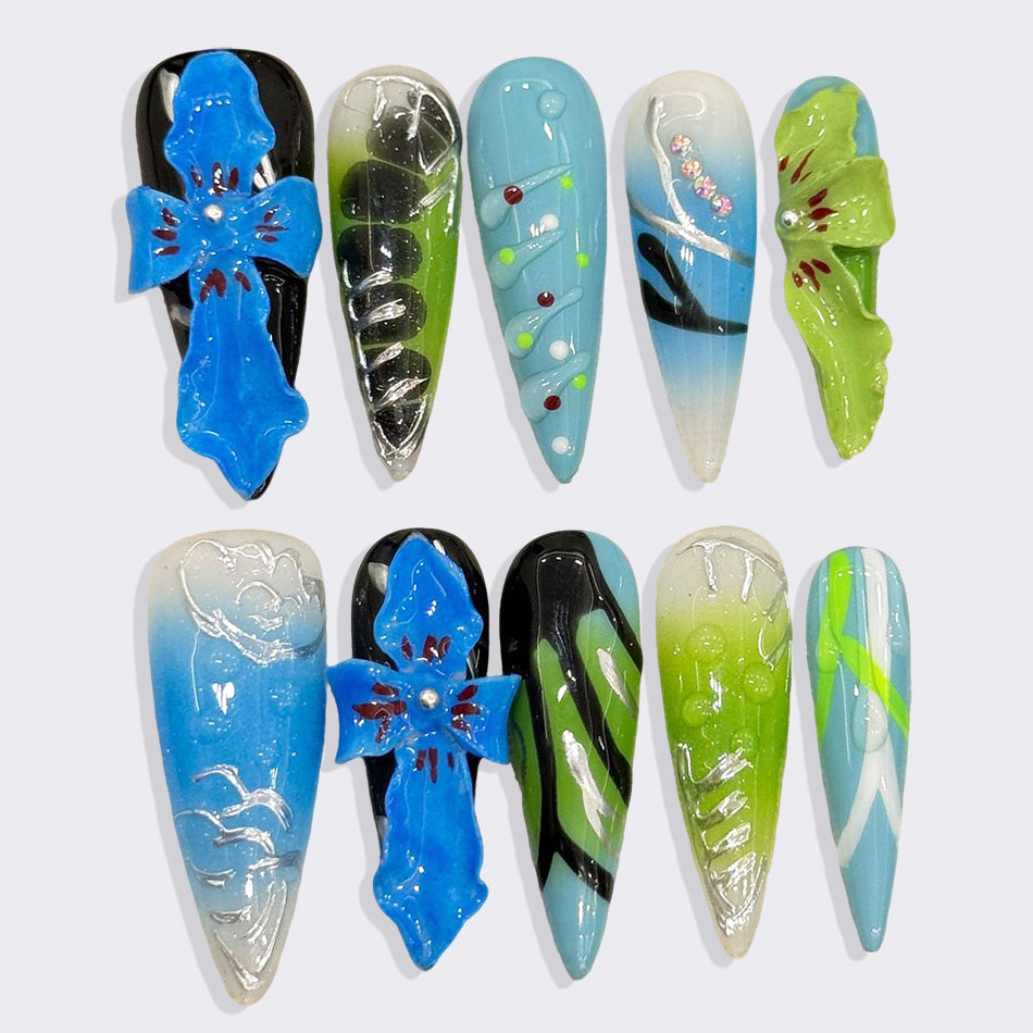 A striking fusion of deep blues, lush greens, and bold floral artistry, these press-on nails evoke a mystical garden at twilight. With elegant gradients, 3D blooms, and shimmering details, they blend nature’s beauty with dramatic flair—perfect for those who dare to stand out in style.