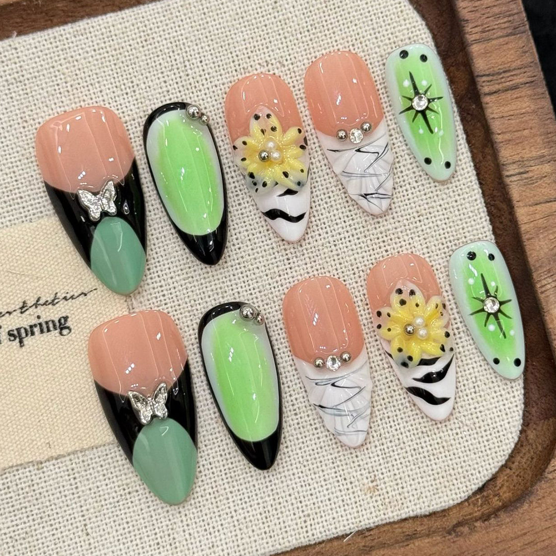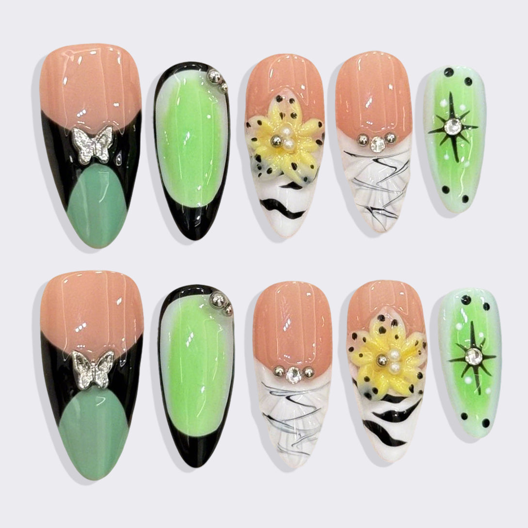 A vibrant fusion of soft nude, fresh mint, and bold black, these press-on nails feature elegant butterfly accents, delicate yellow florals, and sparkling rhinestones. With artistic swirls and modern flair, they bring a playful yet sophisticated springtime elegance to your fingertips.