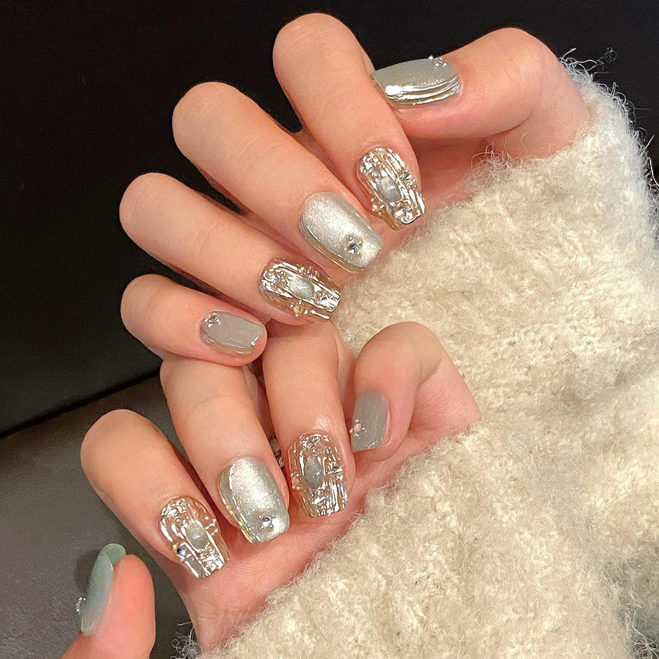 Elegant mint green nails with shimmering gold accents and delicate crystal embellishments evoke a sense of refined luxury. The soft glow and intricate detailing create a dreamy, opulent look—perfect for those who love timeless elegance with a touch of sparkle.