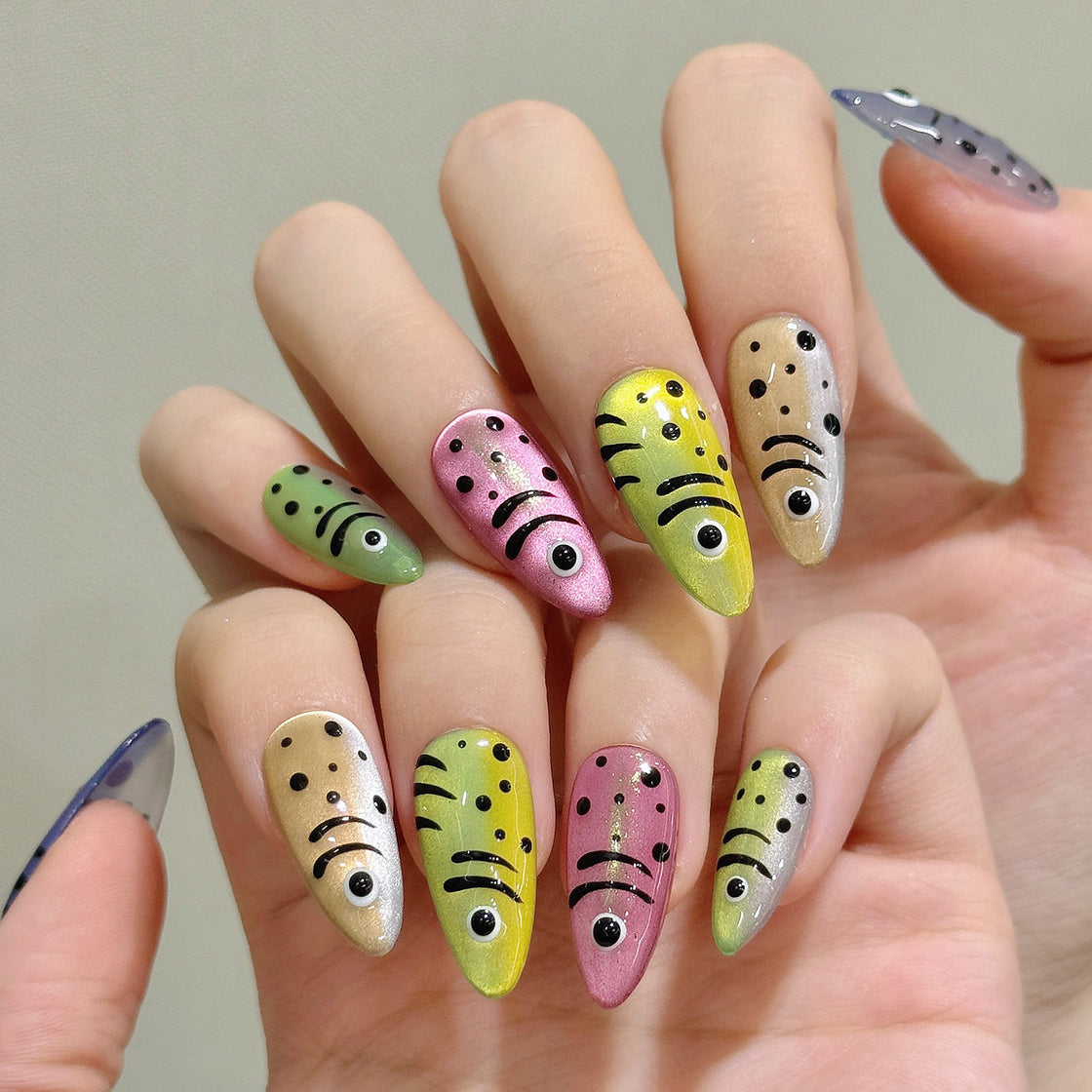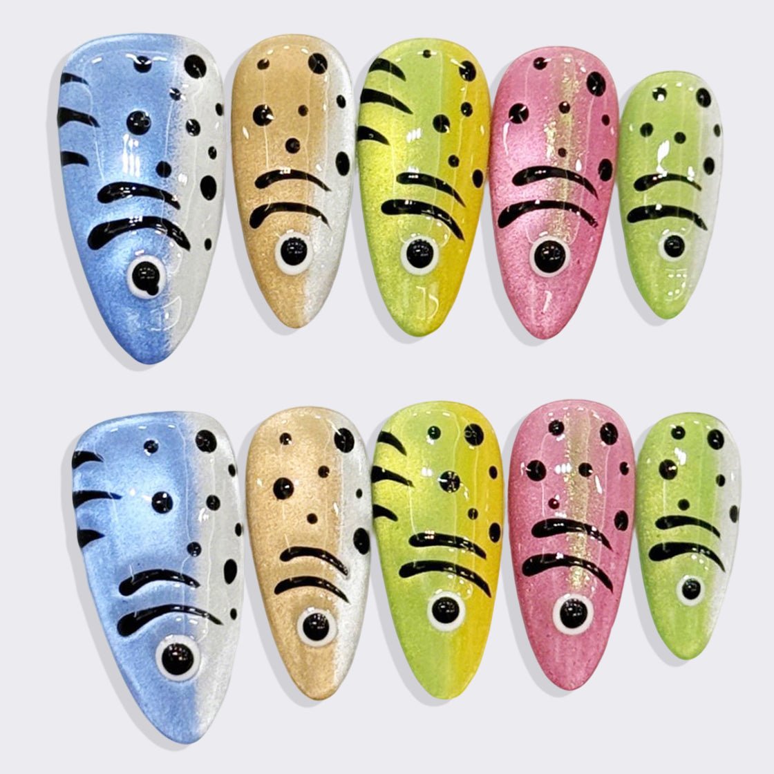 Inspired by the ocean’s magic, these nails shimmer with iridescent fish motifs, delicate scales, and soft aquatic hues—elegant, playful, and perfect for those who carry the sea in their soul.