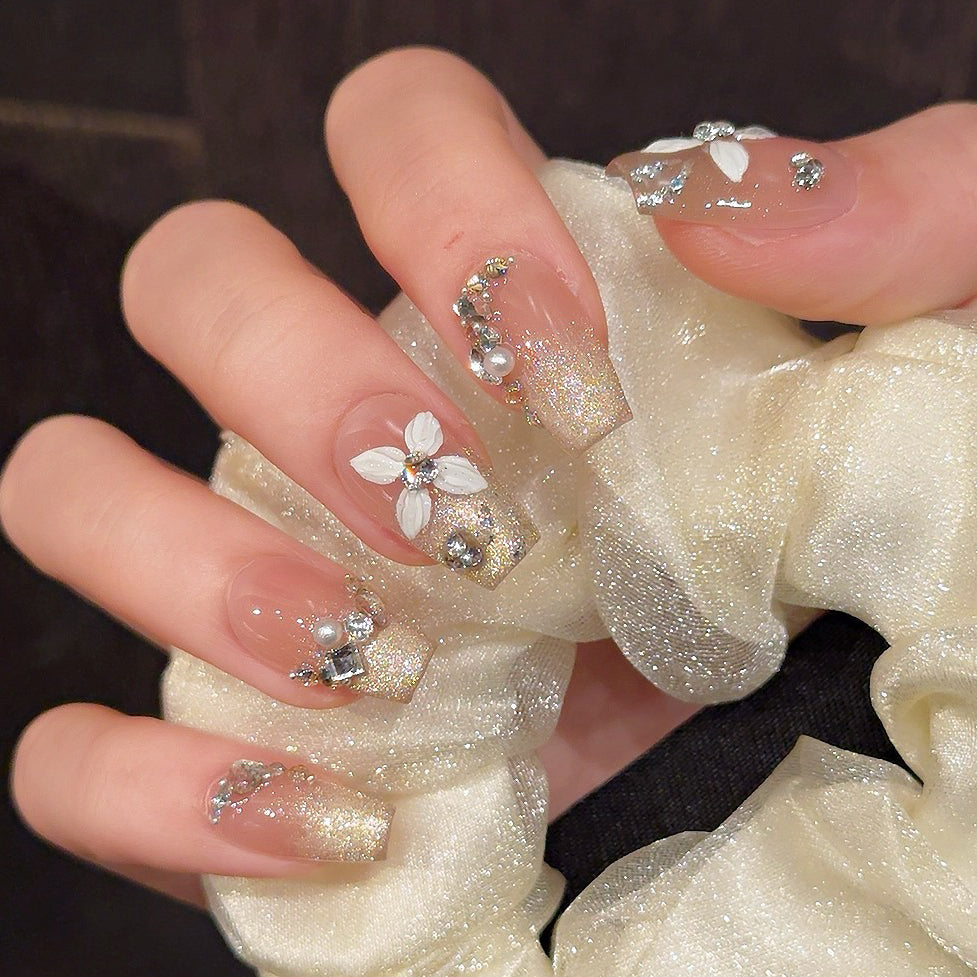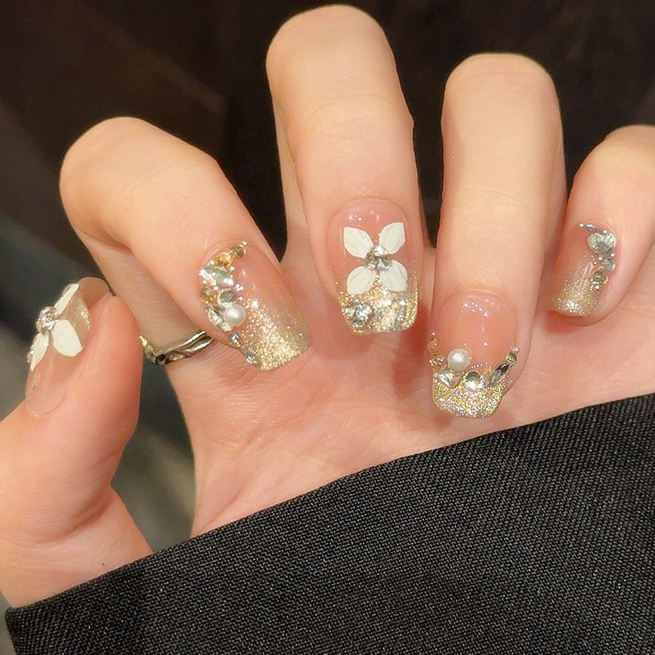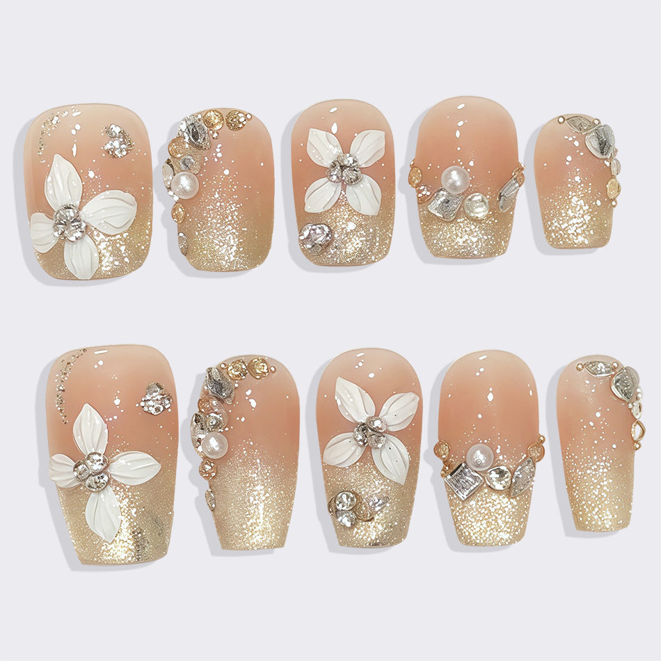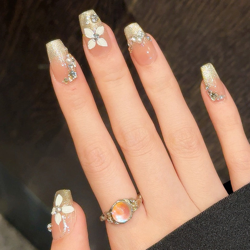 Elegant nude-to-gold ombre nails adorned with delicate white flowers, shimmering pearls, and sparkling rhinestones. A harmonious blend of soft romance and luxurious shine, perfect for a timeless, graceful look.