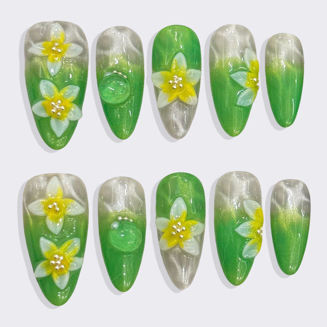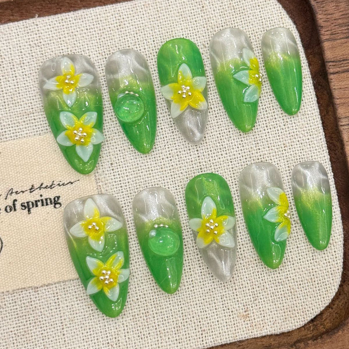A refreshing blend of vibrant green gradients and delicate 3D daffodil flowers with dewdrop accents. This set captures the essence of spring—fresh, natural, and full of life—perfect for those who love nature-inspired elegance.