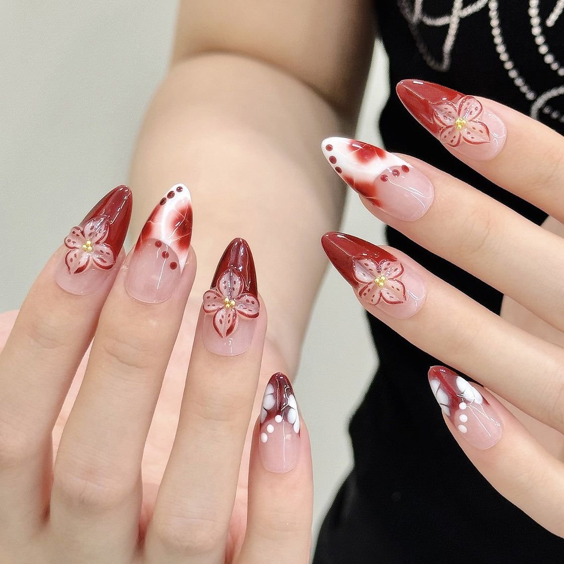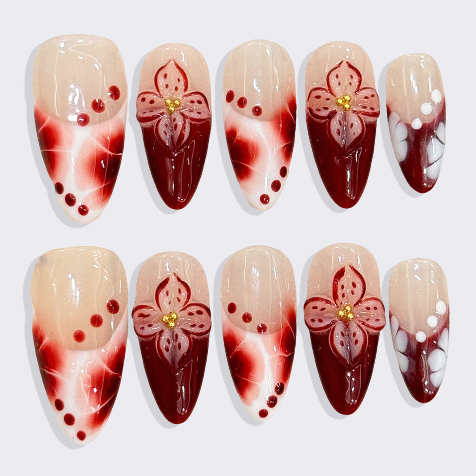 Elegant nude nails with bold crimson splashes and delicate 3D floral accents, featuring gold centers and subtle dots. This dramatic yet refined design blends romance with a touch of mystery—perfect for those who love bold, artistic elegance.